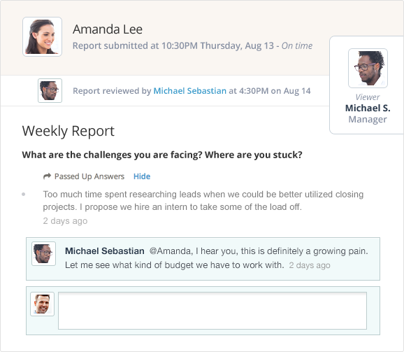 We created 15Five out of the belief that much of the management philosophy behind traditional performance management evolved during the industrial revolution and is no longer effective, and more often than not counter productive. Treating people like assets or resources of companies, and trying to coerce them to perform through a system of external rewards … See more
