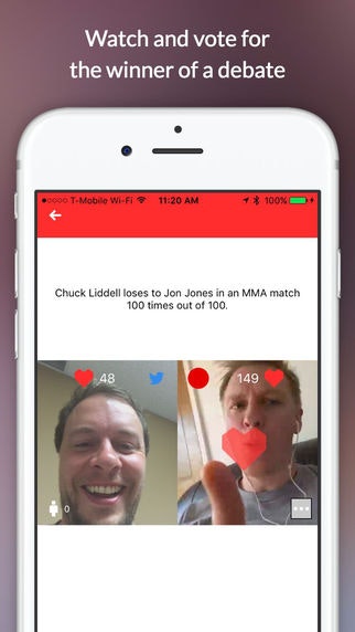 This could be huge. What better way to indulge the common desire of all humans than to provide a way we can all spout our hot sports opinion to the masses. I will say either the current user base is shy, or I need to spread the word about this app and get some new challengers because i am currently unchallenged haha. Also, curious as to how I can watch other… See more