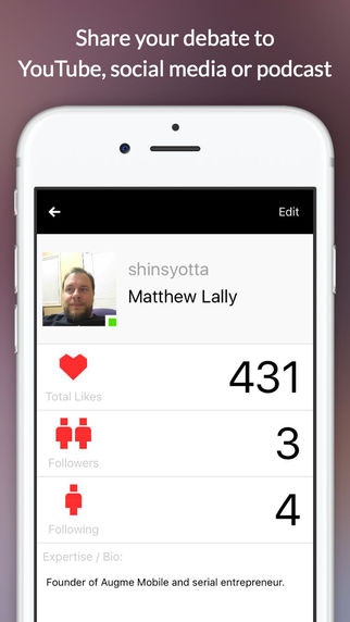 Saw an early version of the app and did a live debate with @matthew_lally. The magic moment was seeing someone on the other side. Really interested to see how the app evolves.