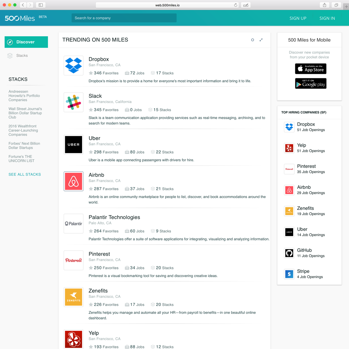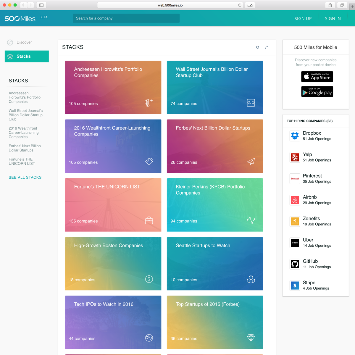 This is Viral, co-founder and maker of 500 Miles. I co-founded a company with @muralisa to build a platform that helps young professionals discover companies at the cusp of breaking out into successful organizations, and get hired by them. The product uses a deep analytics and machine learning platform to develop key insights based on unbiased information ab… See more