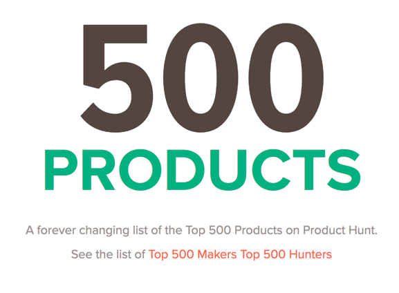 500 Products is a list of the top Products of all-time on Product Hunt, updated once a day. You can also sort the list by year. It's interesting to see which products have resonated the most with the Product Hunt community.