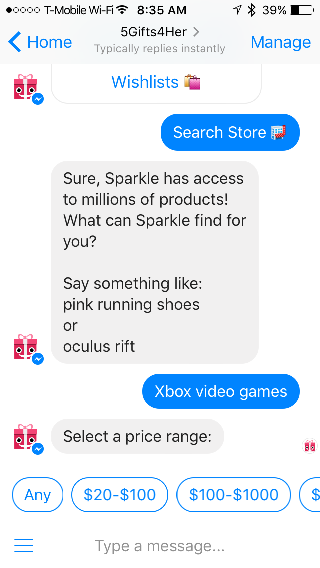 I built this bot to try and solve the problem of quickly finding some great gifts for women. This chatbot eliminates the time it would take to use an app or web browser to find a decent selection of gifts! Suggestions on how best to personalize it would be awesome.