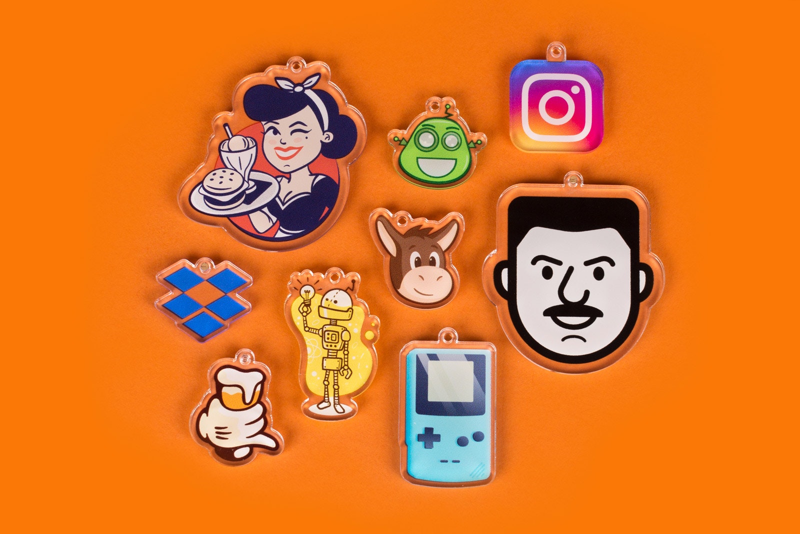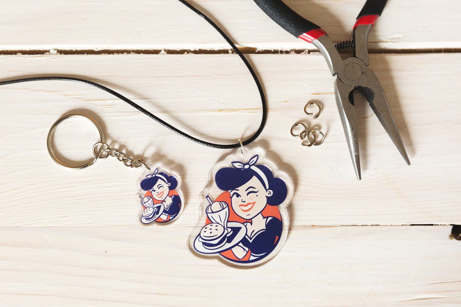 What are acrylic charms? They're made from a solid, clear material that can be printed in full color and cut to any shape. They feature a small hole for creating your own keychains, jewelry and more.