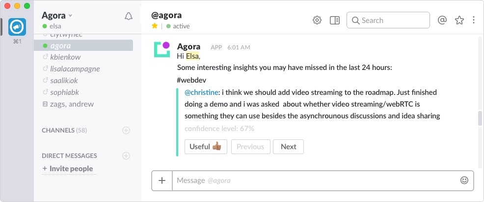 Iβm extremely happy to see Agora on here. Iβve known @elsasze for several years now and have watched Agora grow to where they are now. I definitely recommend trying out their new product for [Slack] teams π.