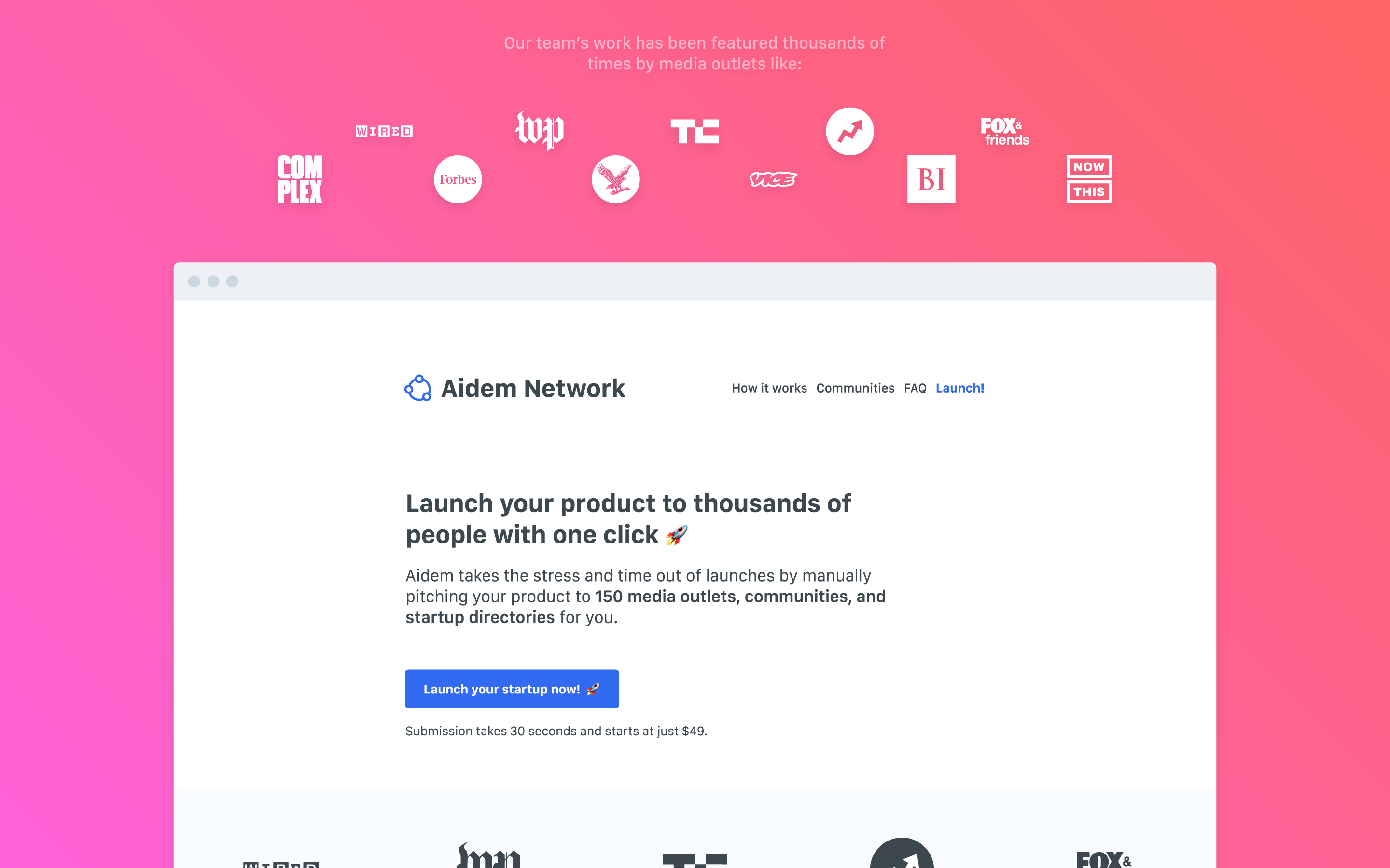 Aidem is a simple tool to get your product in front of thousands of people with a single click. We hand-craft custom pitches for every product, then manually submit them to hundreds of journalists, communities (like Show HN), and directories (like the Startup Button). 🚀