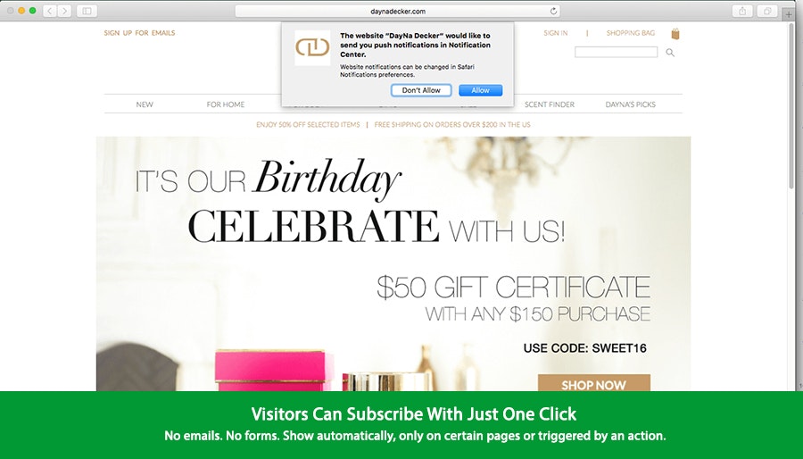 New website visitors are presented with a prompt encouraging them to receive notifications from your site.