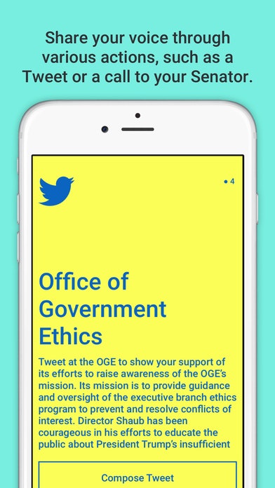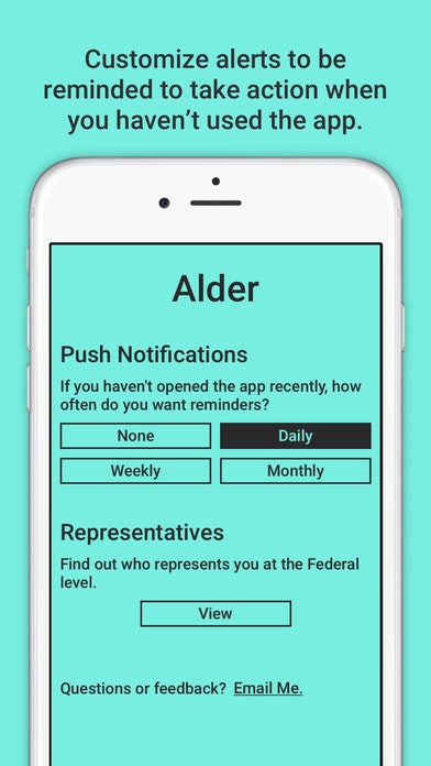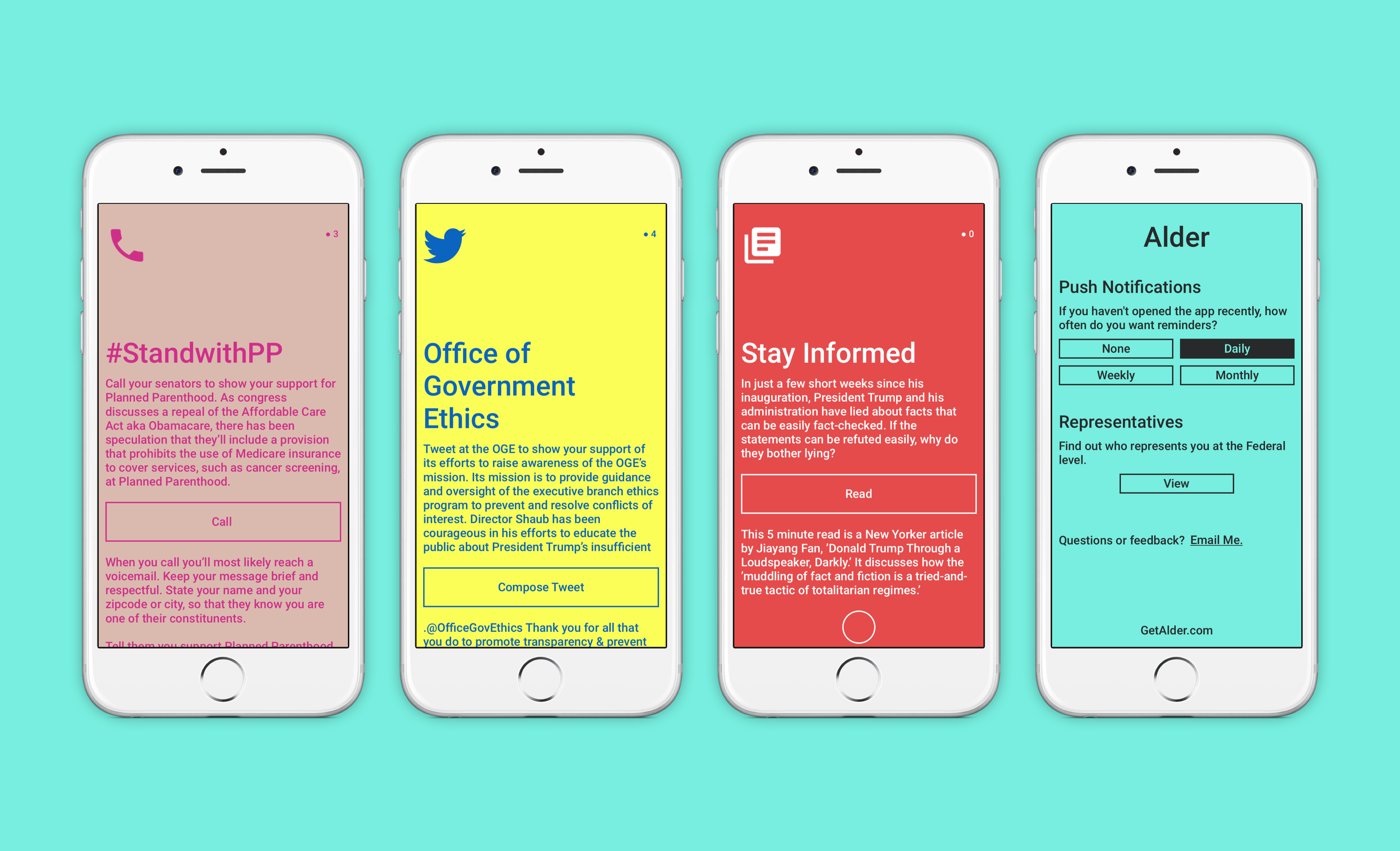 "Each day, Alder gives you one relevant political action to take. It’s easy to feel paralyzed with the amount of news coming out of Washington. Alder ensures you stay informed and focused on the most important social issues. It makes it easy for you to have your voice heard through a Tweet, a call to y… See more