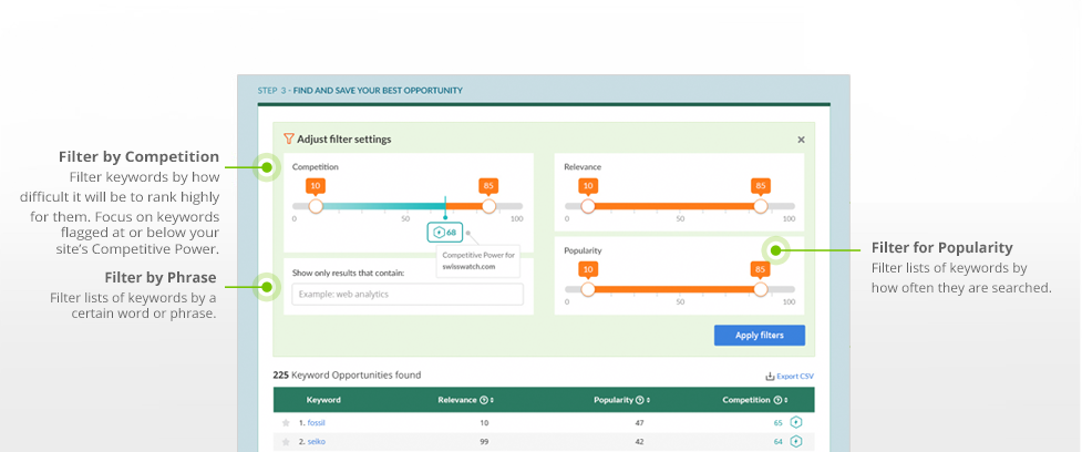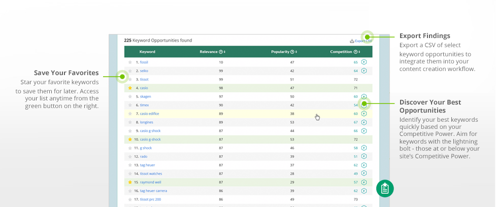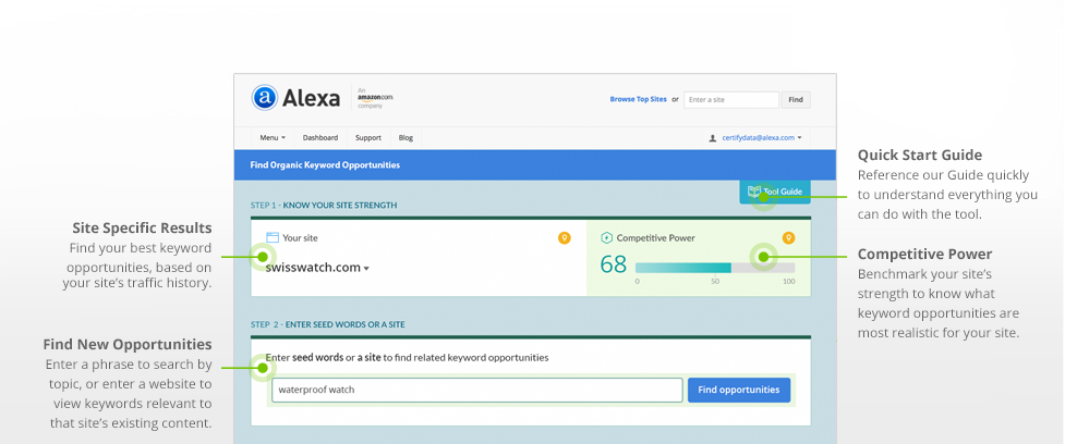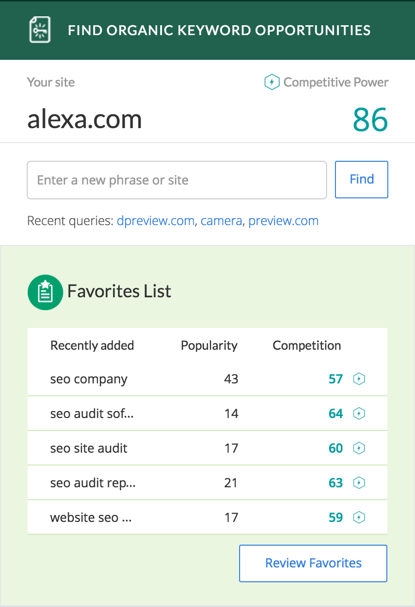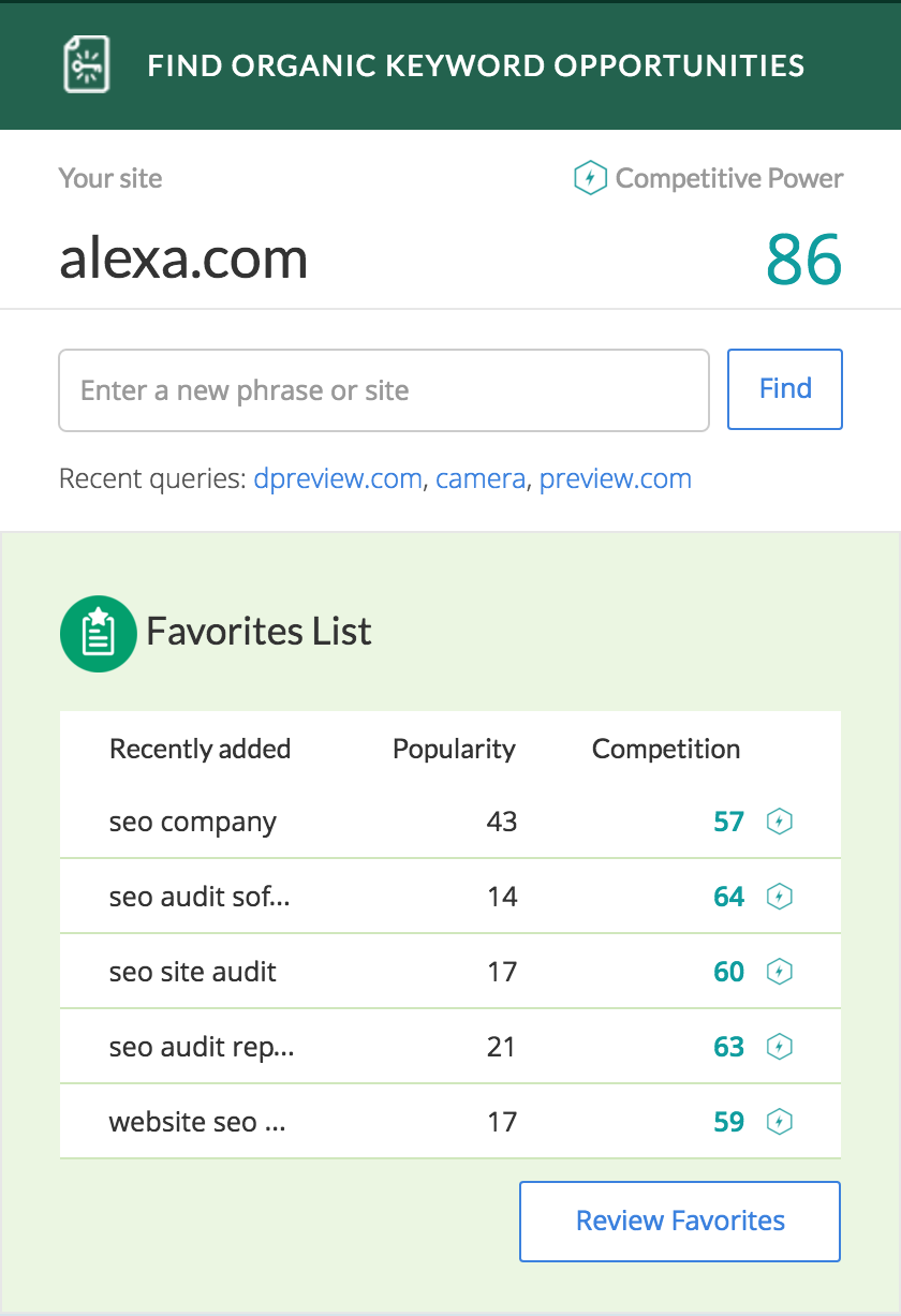 Alexa's Organic Keyword Difficulty Tool reveals your sites ability to rank for keywords using their unique Competitive Power Score. Your Site's score will help you understand which search terms are worth your time & effort, and which are out of your league.