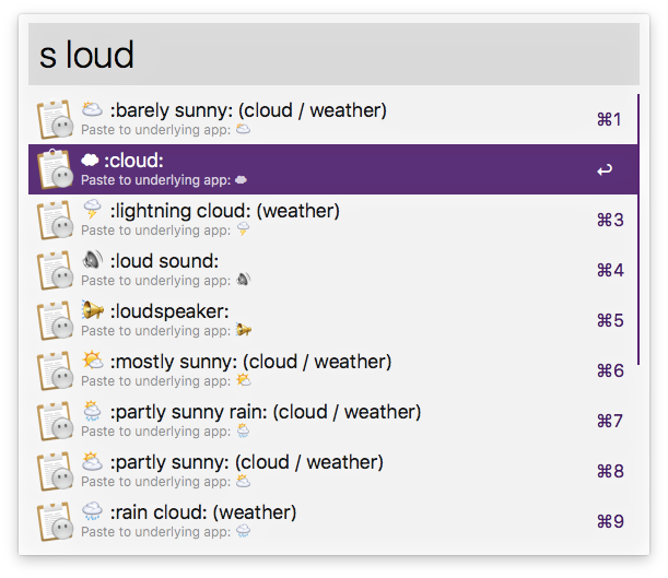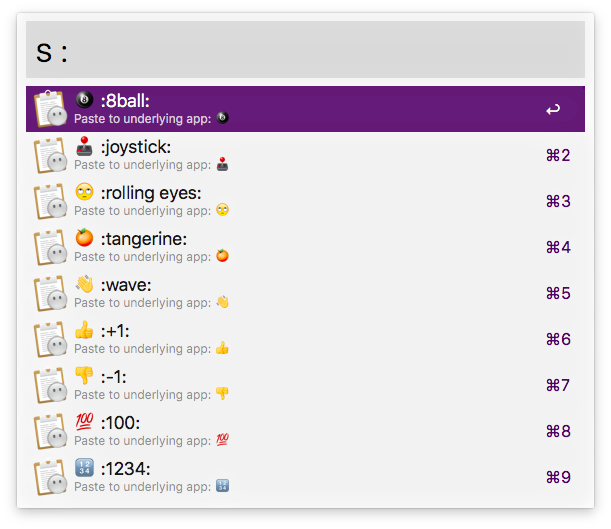 This is really cool! I'd recommend disabling snippets for Slack if you're going to use these Emoji snippets, though. Weird stuff happens that clashes with their Emoji picker: