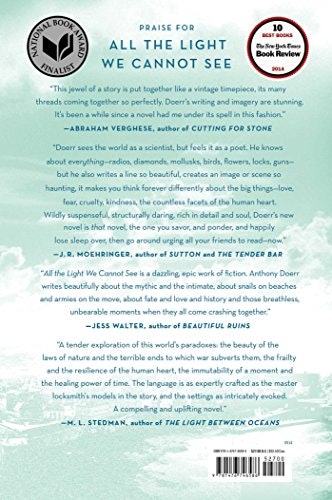 This is a beautiful book about how war affects normal people. It mostly follows a french girl and a young German soldier during WWII, going back and forth to tell the story of the war from people thrust into it. Highly recommended. At times, heartbreaking.
