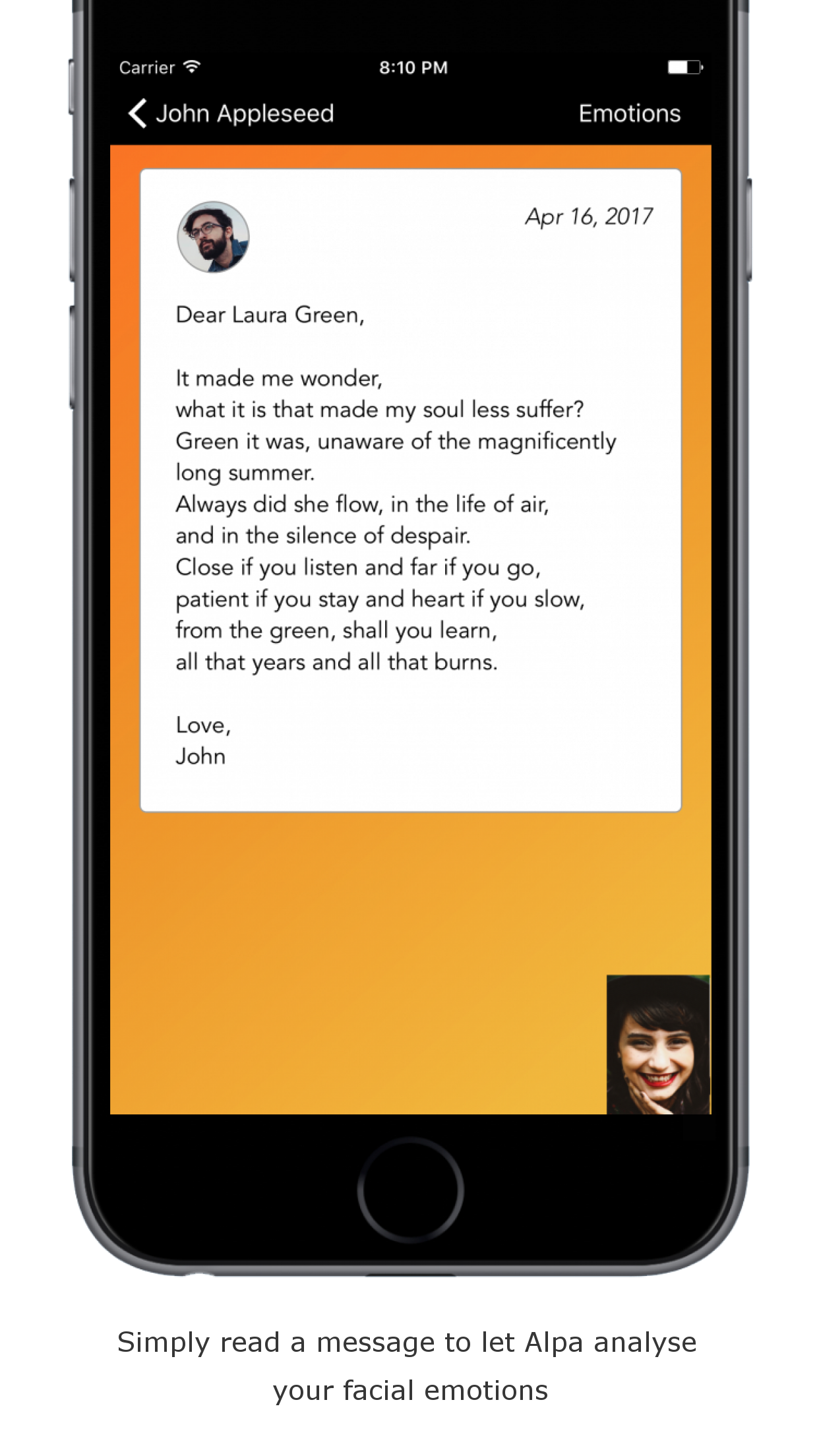 Simply read a message and Alpa analyses your emotions through the camera, conveying exactly what you felt to the sender. Aimed to remove the mechanical aspects of sharing reactions, Alpa provides the convenience of messaging while beautifully stitching it with the … See more