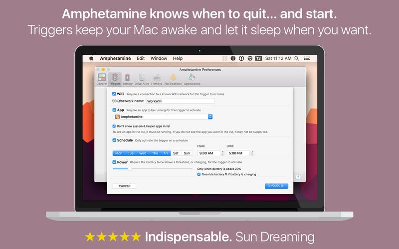 - Triggers and sessions, ie, stay awake only when certain conditions are met (on a specific WiFi network, specific apps are running, etc.)
