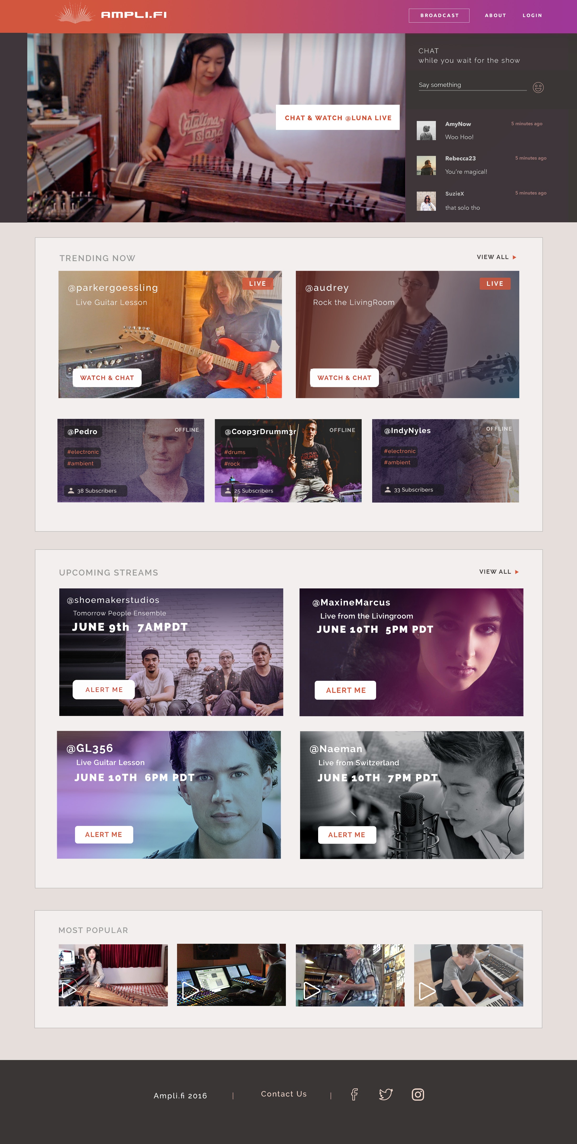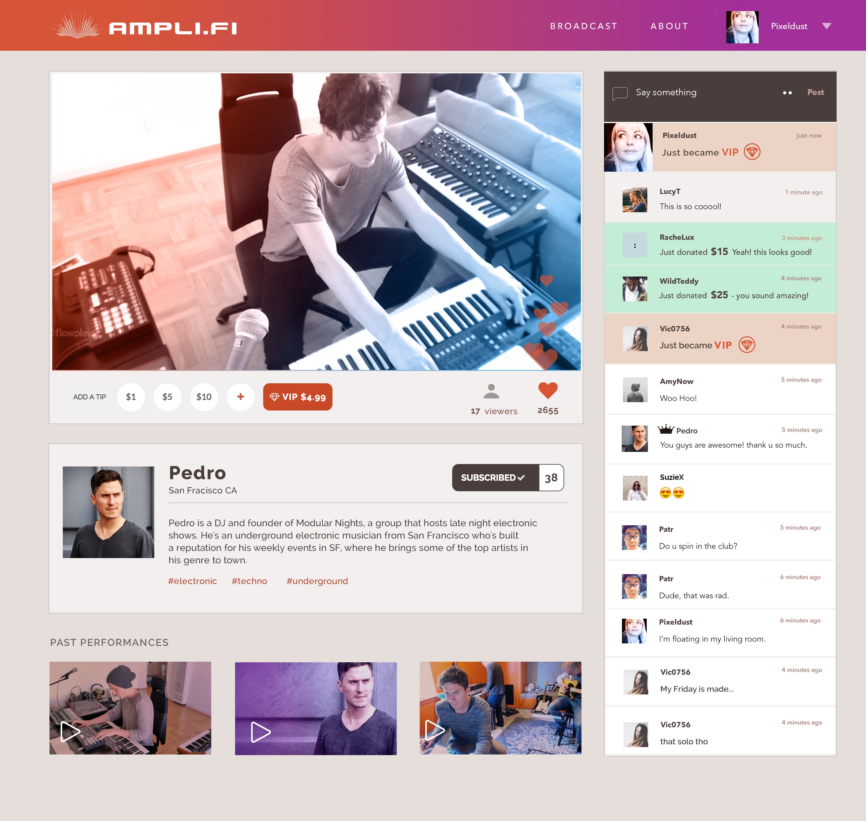 AMPLI.FI is Twitch for musicians. it's a live streaming video platform that allows artists to interact and engage with their fans. It also helps them make money with their integrated tipjar and VIP service.
