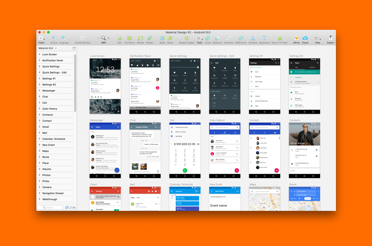 We’re back with another nice free collection for you. Android GUI contains a set of interface components and 61 great screens from Android 7.0 Nougat, made with extra attention to the Material Design Guidelines. We combined them for Sketch in 1x resolution (360x640px) and pumped up with resize options, symbols, layer and text styles.