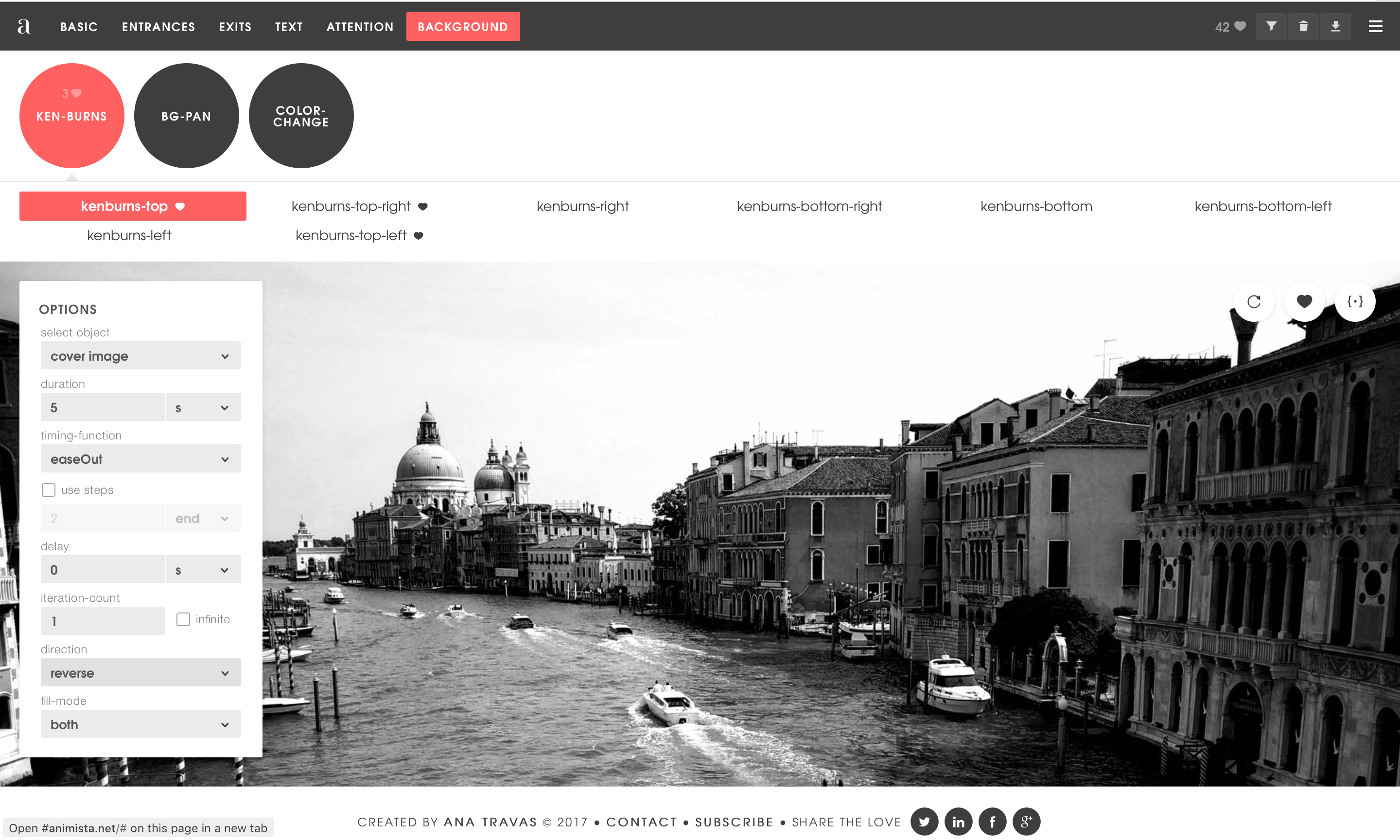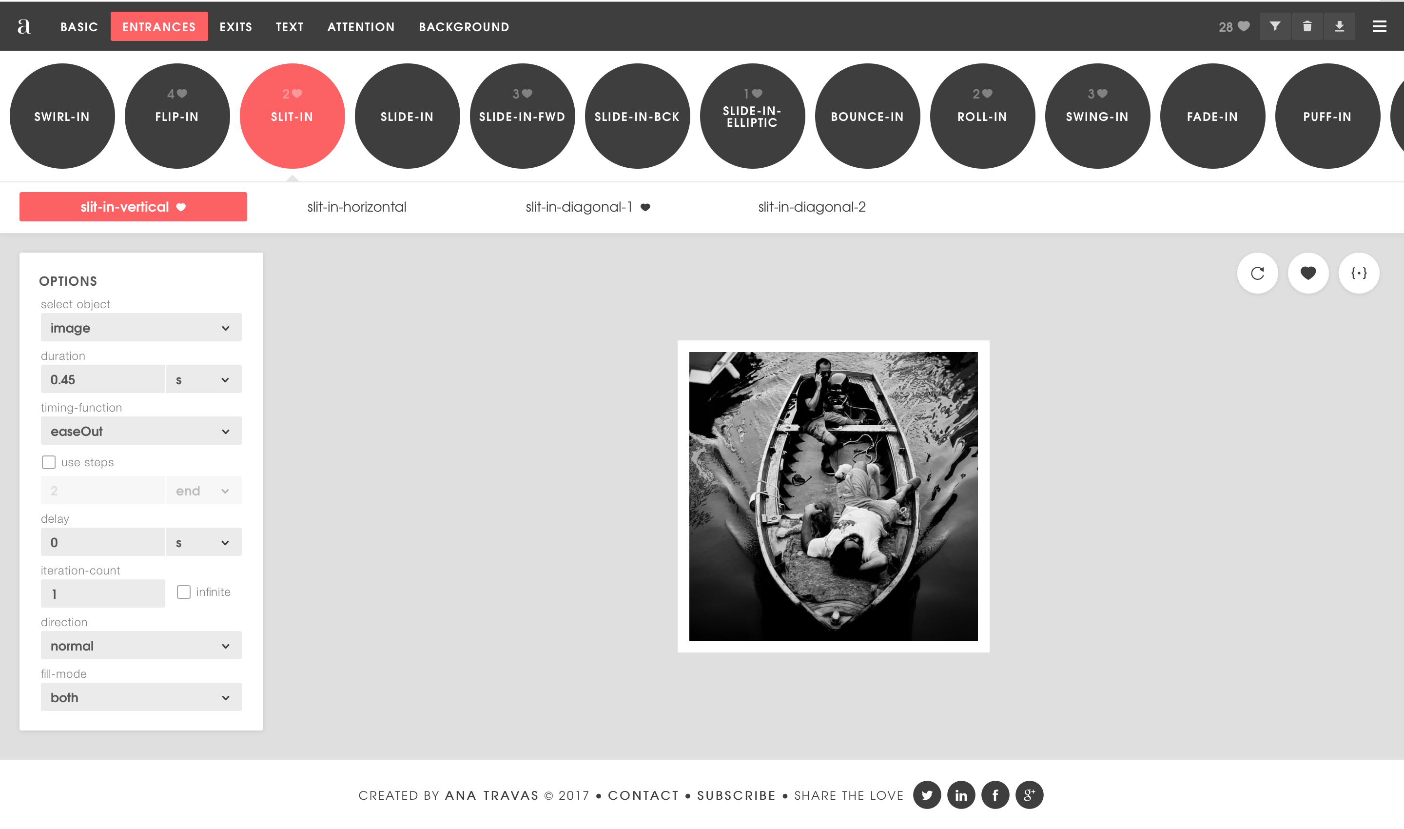 Animista started out as a small side-project of mine. As I was increasingly using CSS animations, I thought it would come in handy to have them organised in a meaningful and accessible way so that they can be easily reuse… See more