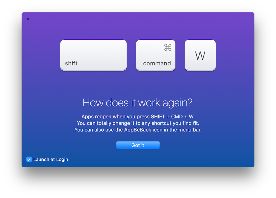 App Be Back is a small Mac app which keeps track of all apps you quit. You can reopen them with ⇧+⌘+W shortcut or from list. Enjoy!