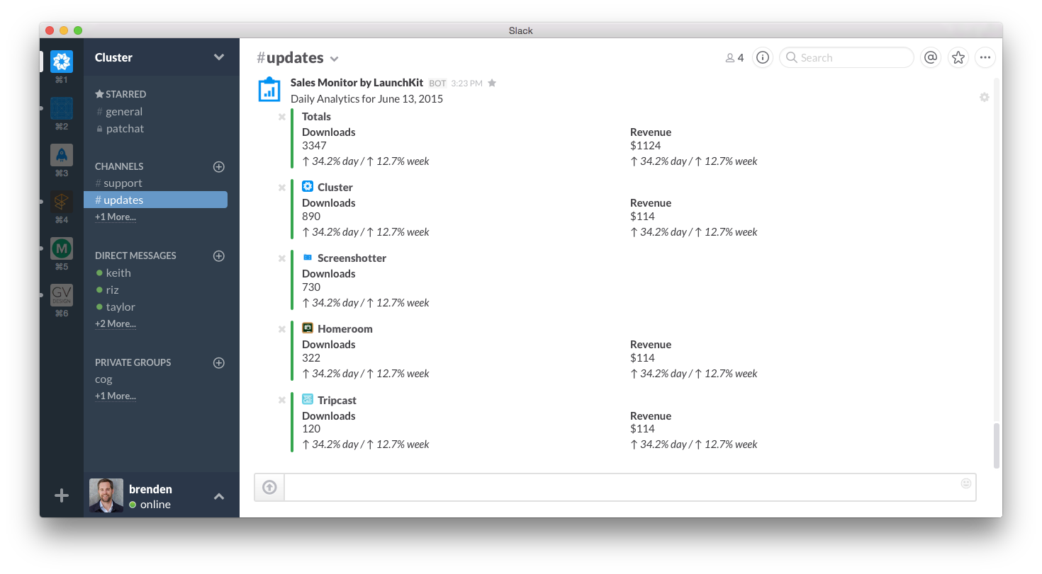 After a simple setup, the tool starts posting sales data into Slack daily. The posts are color coded depending on how the app is trending, and include both yesterday’s sales inf… See more