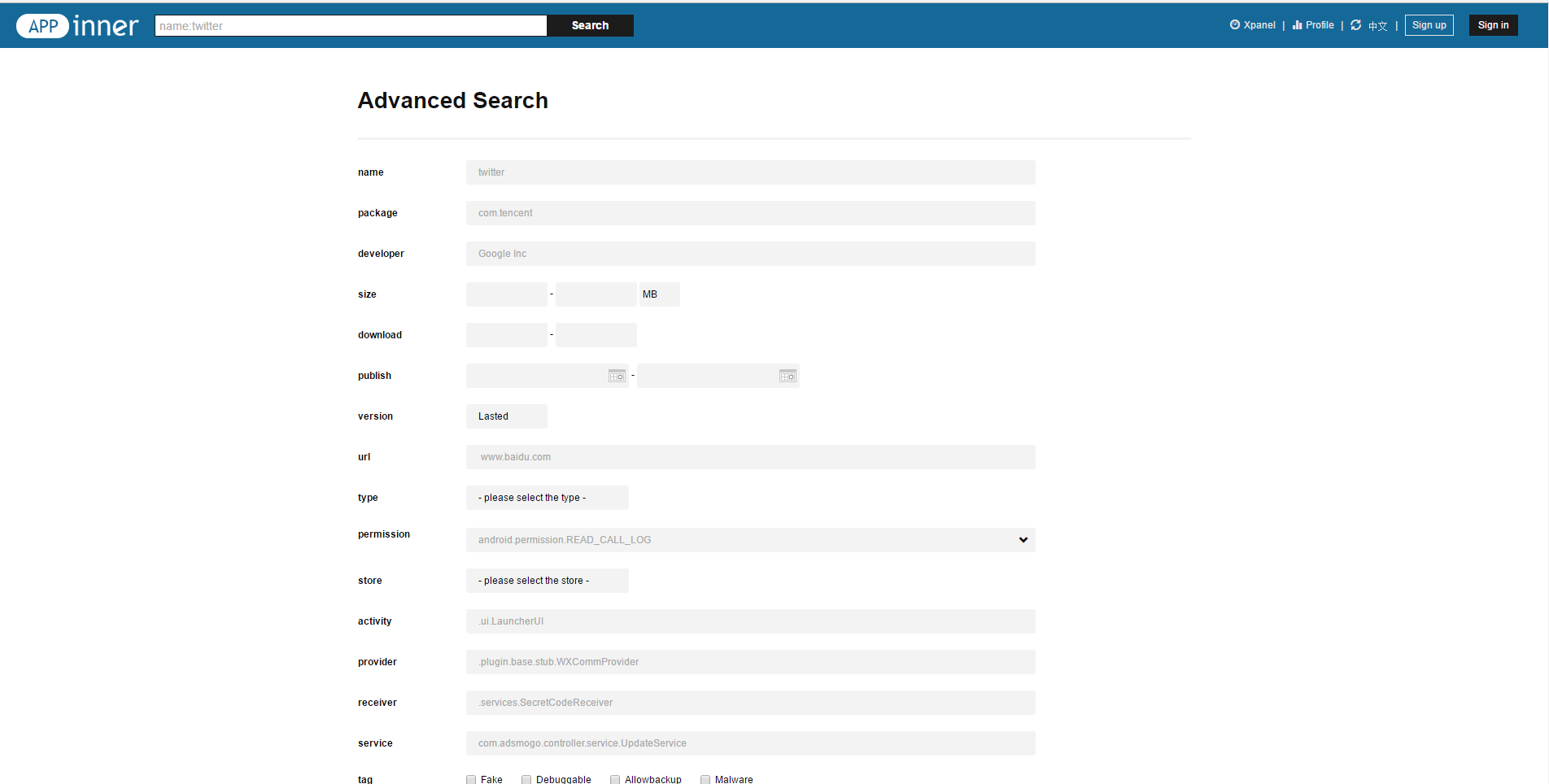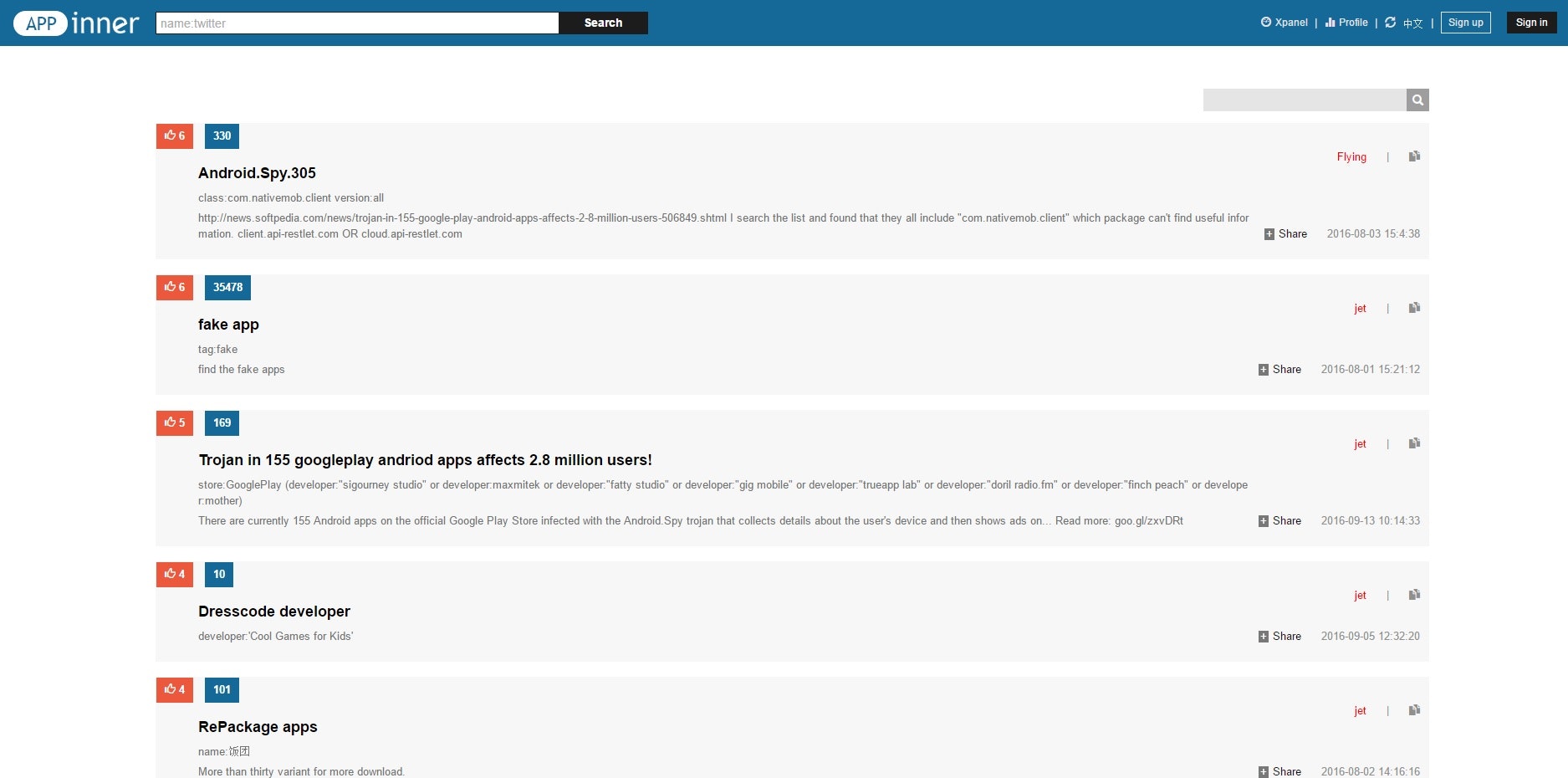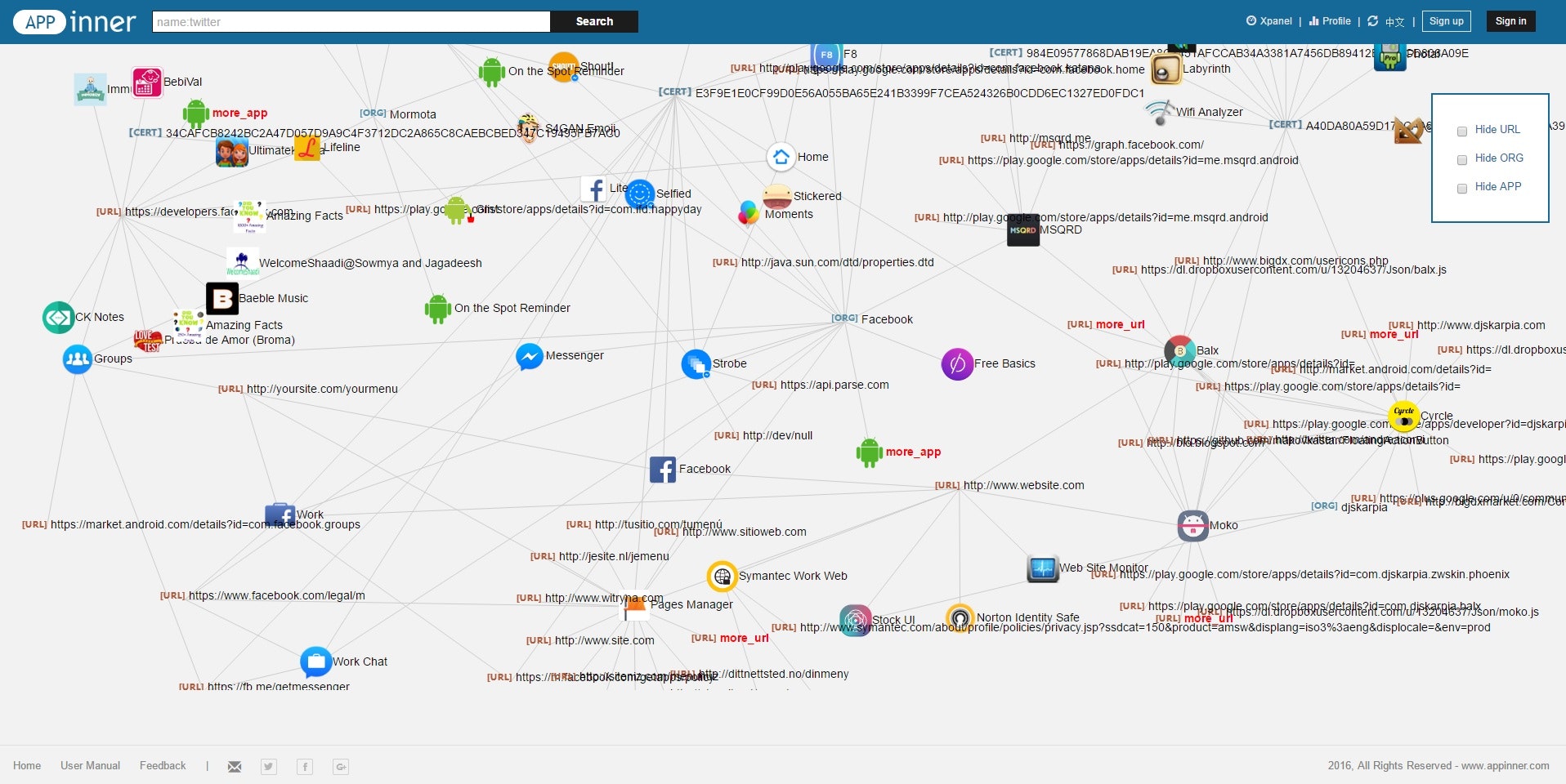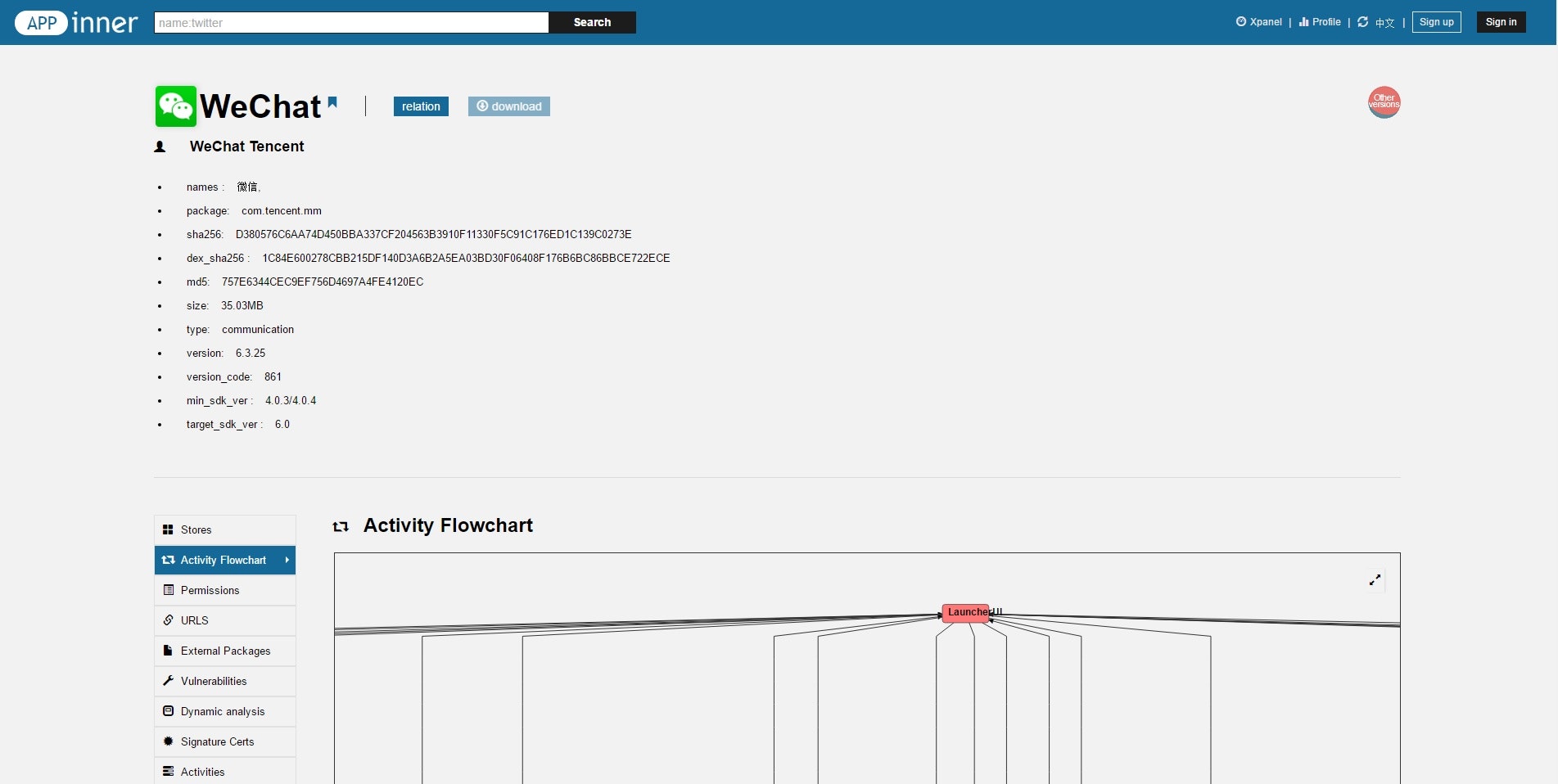Appinner.com is an app internal data analysis system,you can search every app meta data such as sdk、url、permission、vulnerability、signature certs、activities、control flow chart、ui,etc.