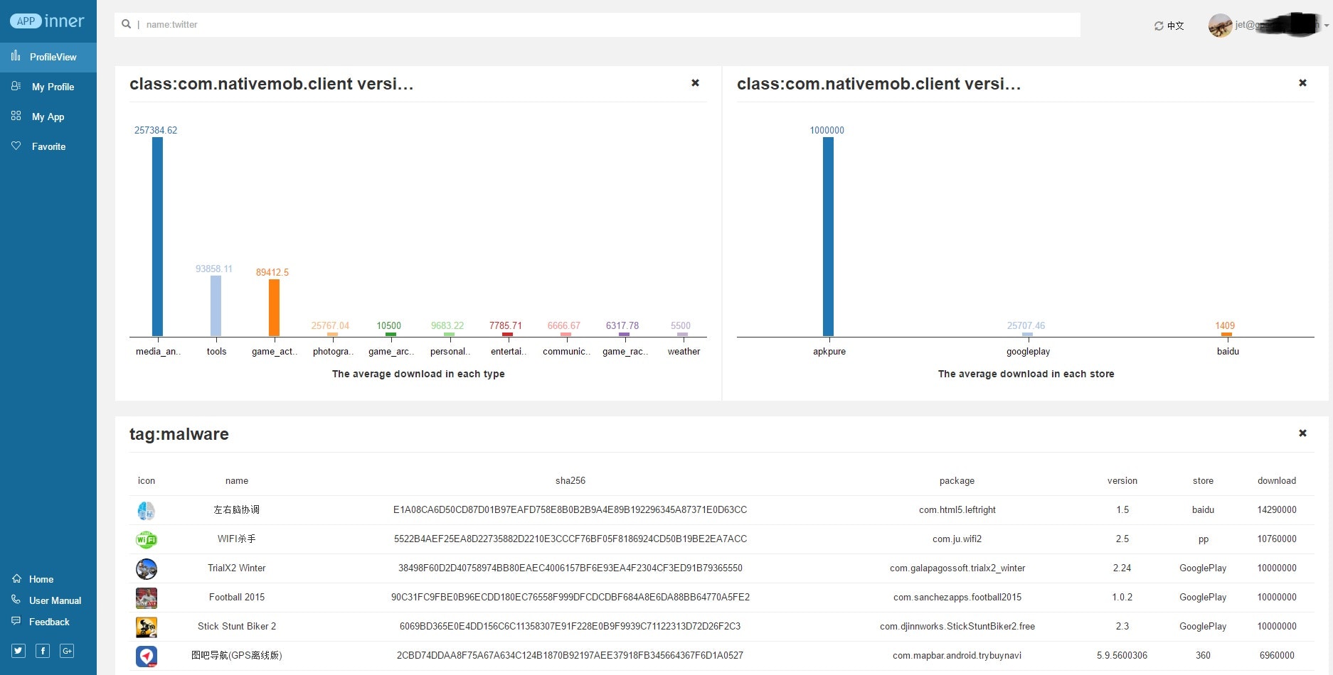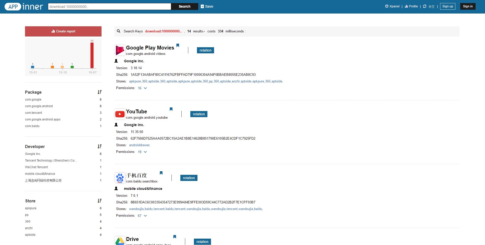 The database contain morethan 40 appstores,include googleplay,amazon,myapp,mi,Huawei,wandoujia,360,91,baidu. It is a data analysis platform for app store to do some muti-dimensional app statistic,safety evaluation,trend analysis;it is a design wizard for app developer to do external packages or sdk selection,design patterns reference;it is a competitive analysis for product manager to monitoring competitors situation,do products iterative analysis, app features selection,ui design, control flow chart analysis; it is a mobile strategy analysis for ceo or venture capital to do app market positon analysis,sdk developer’s market share analysis,mobile advertising’s market share analysis,app competitive analysis;it is a security analysis platform for mobile security researcher to do fake app analysis and statistics,apk download url hijacking analysis,app vulnerability analysis and statistics, malicious code analysis.
