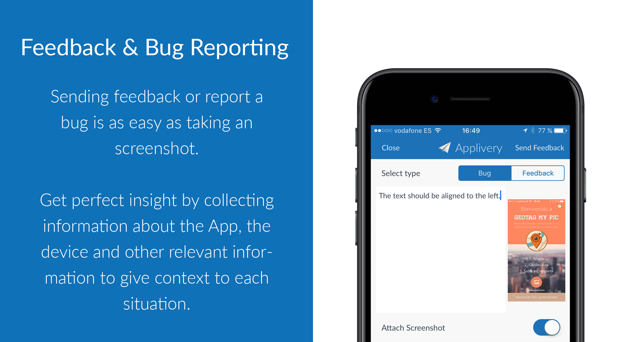 Another useful feature from Applivery is that we also provide both iOS and Android SDKs that brings awesome features that will help you to improve the quality of the Apps and ensure up to date deployments: