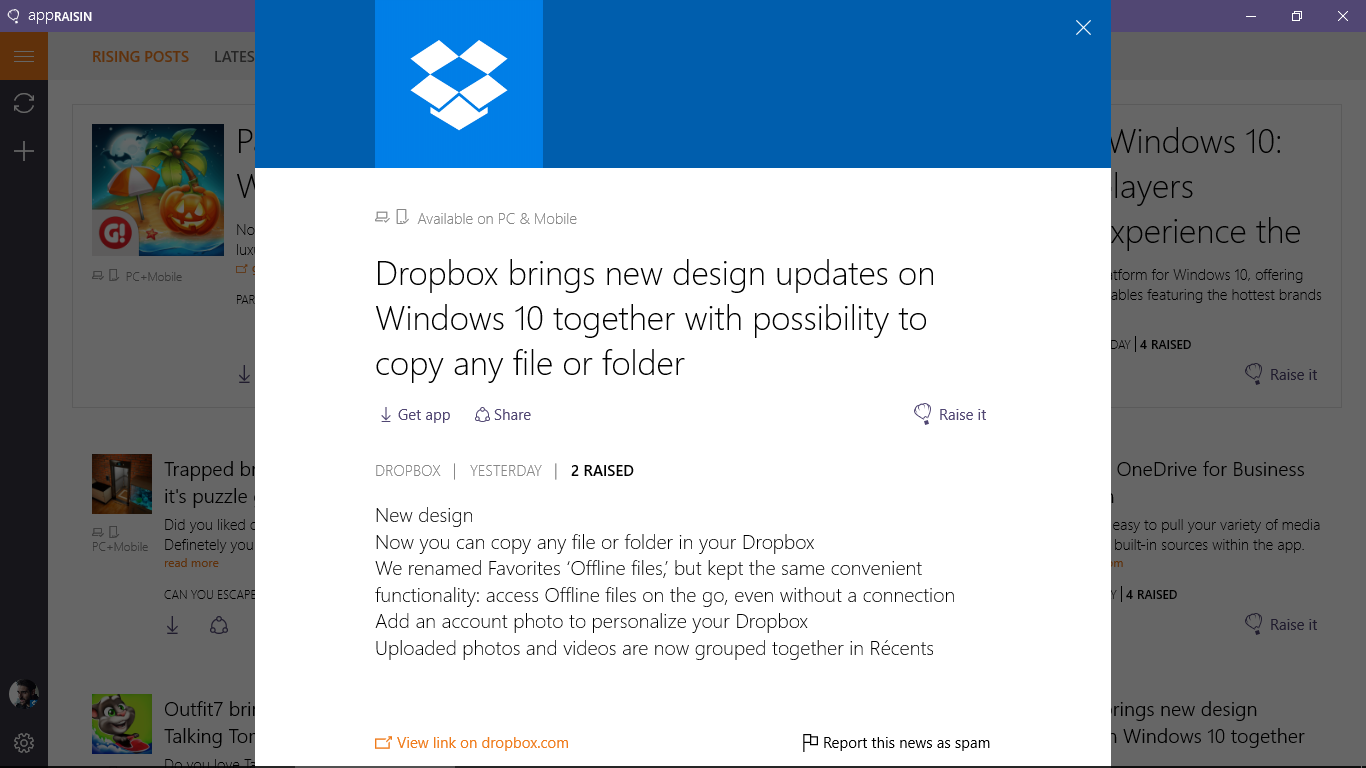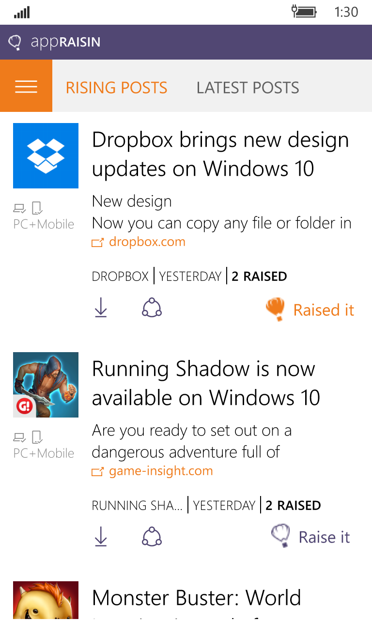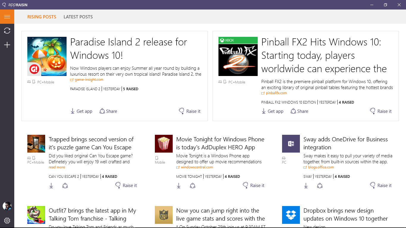 AppRaisin is a mobile-first service aimed at solving the biggest problem in modern app stores - app discovery. AppRaisin helps Windows enthusiasts stay on top of the latest releases, major updates and special offerings. Users decide what news raise to the top by "raising" the apps they like and ignoring the noise. This way enthusiasts get to make sure that t… See more