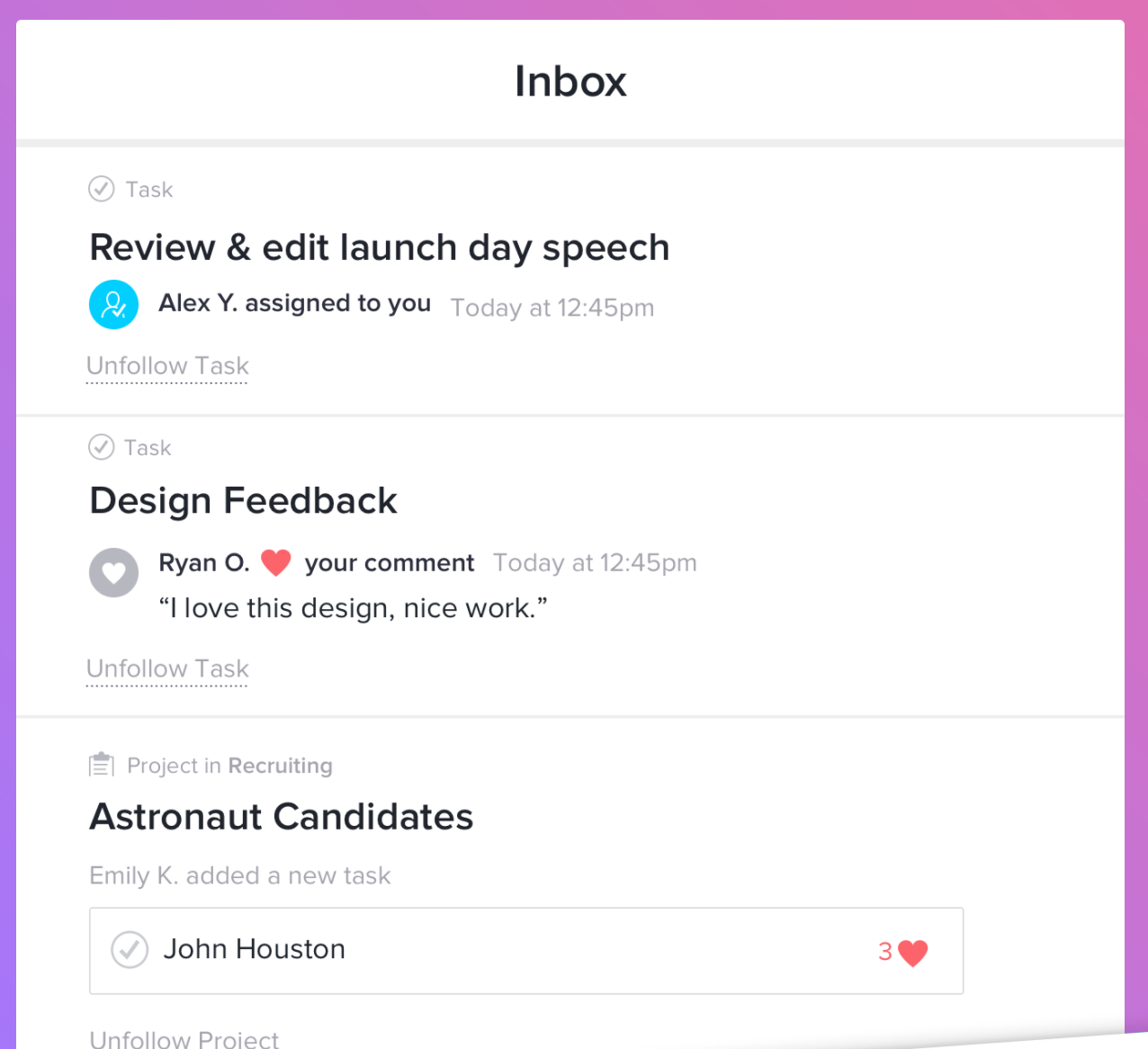I am a huge Asana advocate and use it across 5 different organizations. I love the new design on both mobile & web. A lot of great visual improvements, new logo, etc. Thank you for such an awesome product.