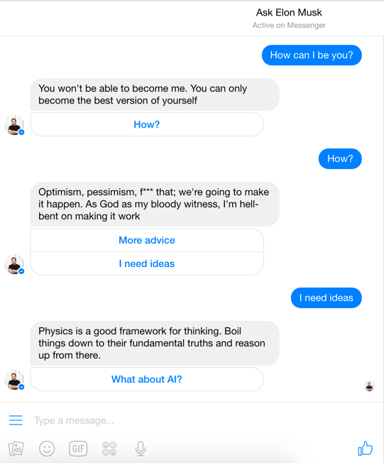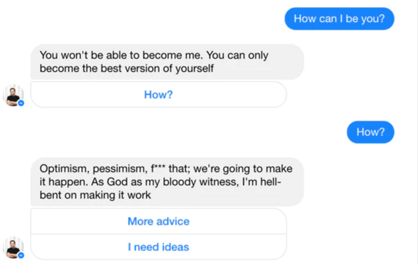 I would love to introduce Elon Musk Bot to @boredelonmusk!