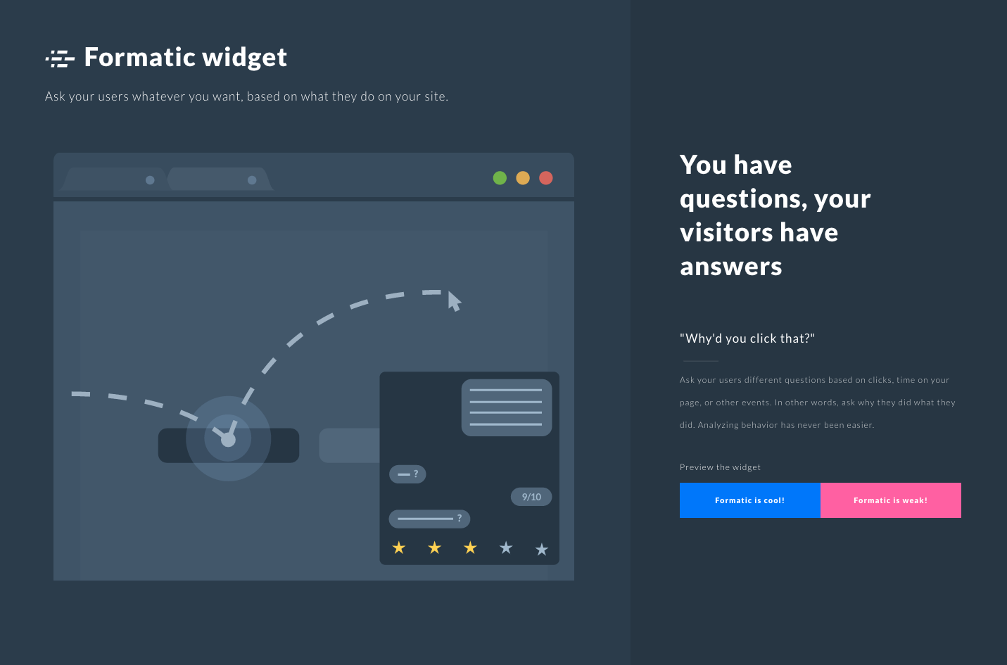 For web products and web businesses, we have an on-site widget that you can use to ask your users anything, like their experience on your site, why they took certain actions, abandoned their cart, etc.
