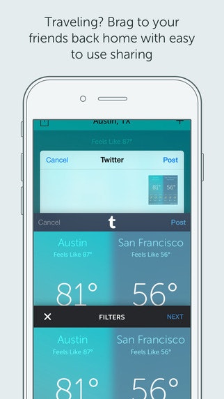 Simple weather app without being too simple, and works really well on Apple Watch. I'm a big fan of the themes & sharing (I taunt with nice weather privately, as we all should). Also a big fan of its makers @saverio and @shnhrrsn