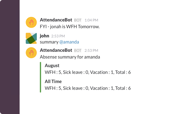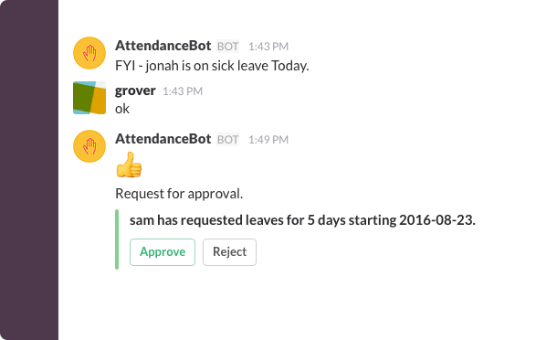 AttendanceBot is an attempt to bring basic leave management to Slack. You don't need any external integration for it to work. Just add AB to your team and tell it 'on leave tomorrow' like you would tell a co-worker and it will take care of the rest (which is recording it and making it available for everyone to see).