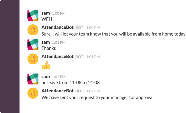 @dillisingh This looks like a very useful product. Great work. While notifying the bot about leaves, does it use NLP or there a strict syntax for time formats? WFH and calendar sync are surely killer features.