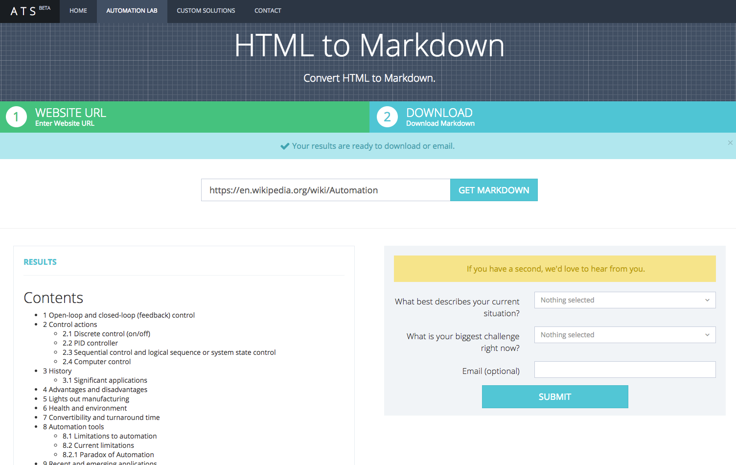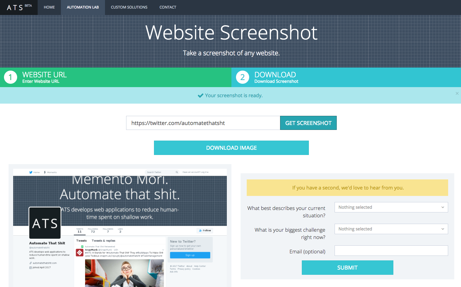 This looks interesting, but i'm not sure in what proportion it will automate my work. For example, i need to take a screenshot everyday of the same website. From what i see on ATS, i just enter the link and then i download the picture. This is good, it eliminates a step or two from my current process, but truly automation for this shit will be if i setup thi… See more
