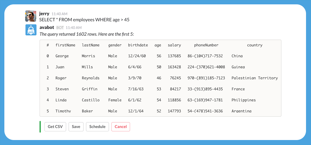 Our bot allows you to easily run, save, and schedule SQL queries in Slack. Saved queries are labeled in plain English, so that non-technical teammates can run queries themselves.