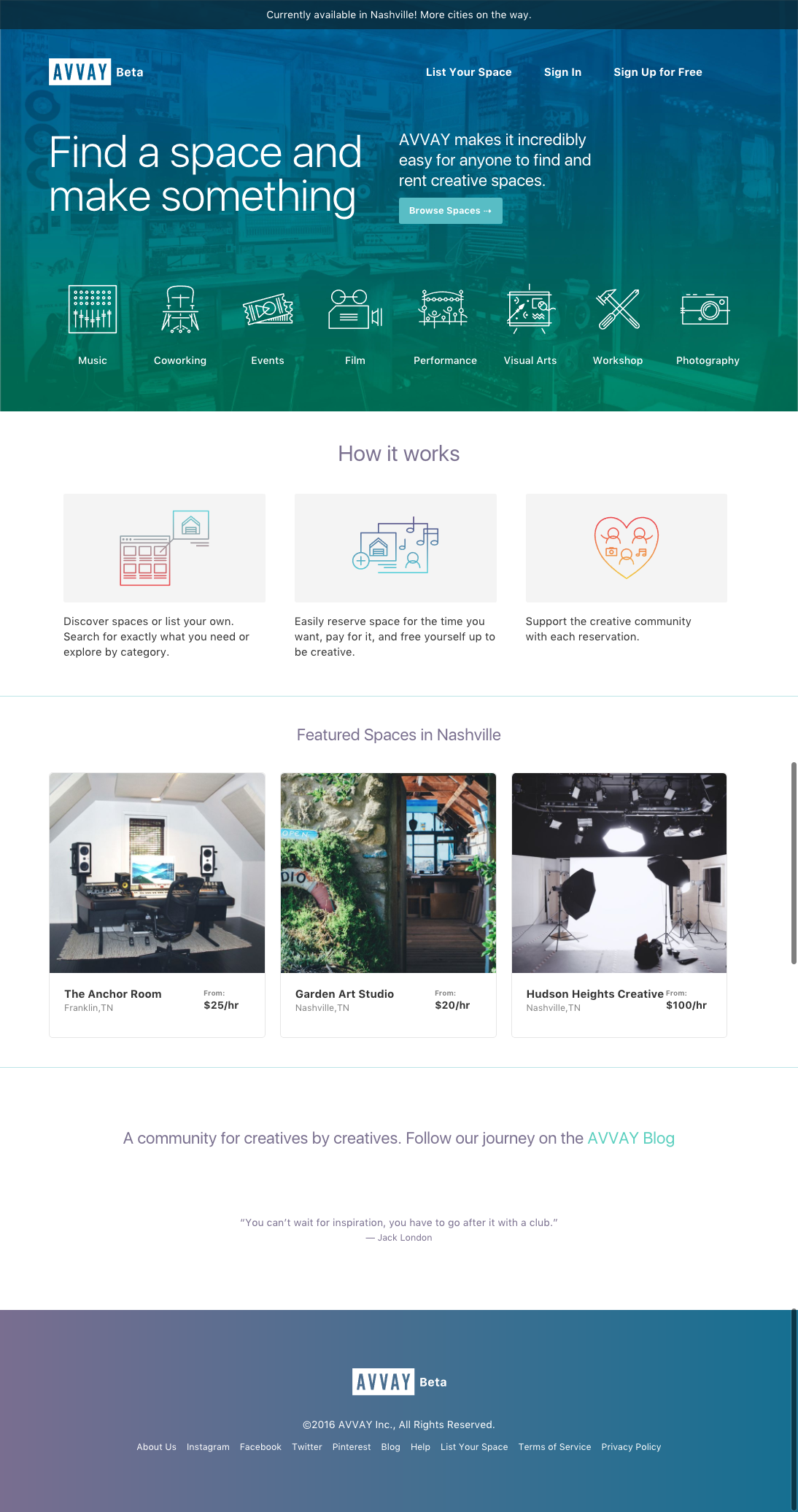 We're excited to share with you our platform, which helps artists, artisans, photographers, and musicians find and list creative space. You can book time in an hourly format or request a custom quote for longer projects.