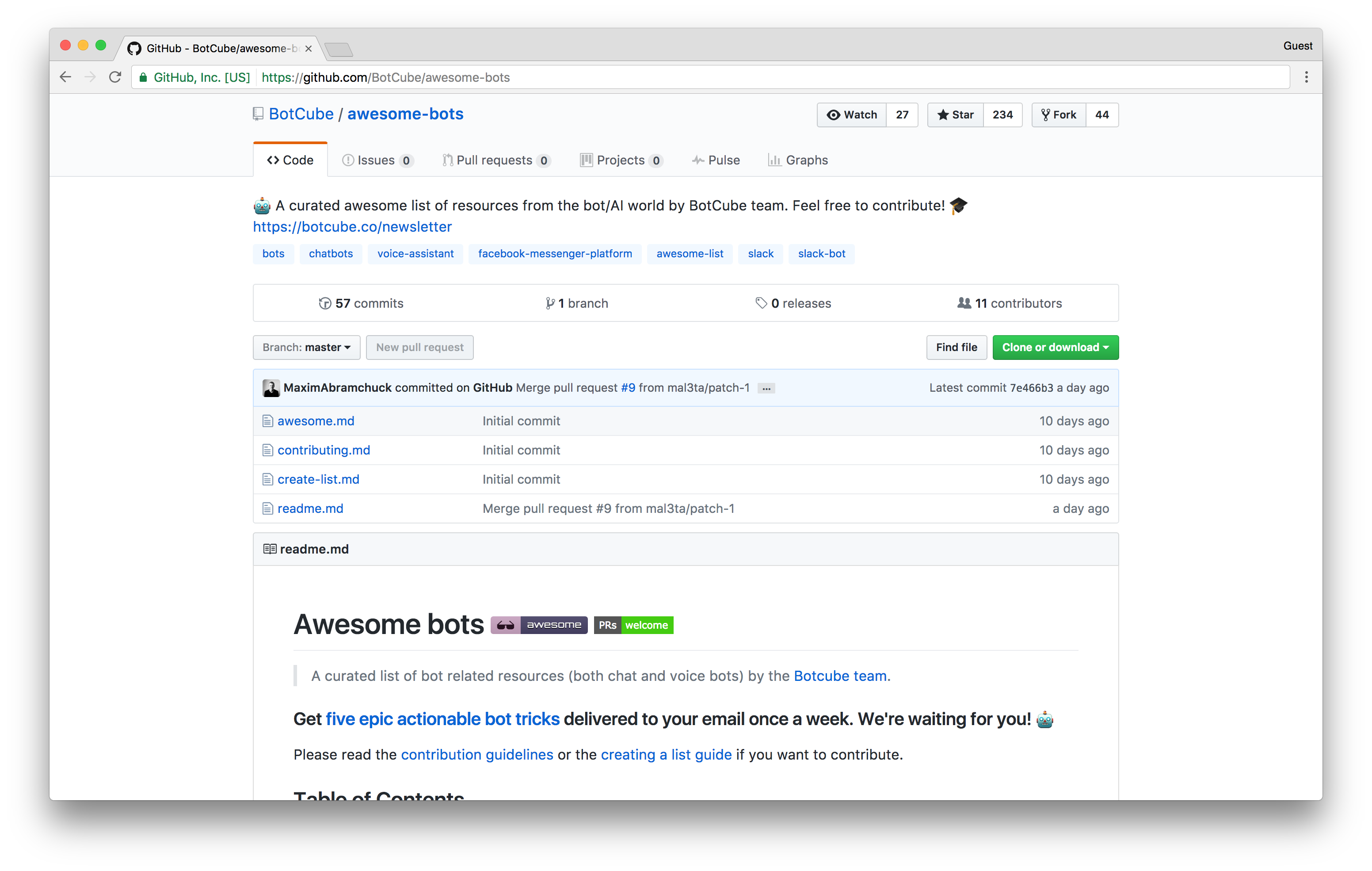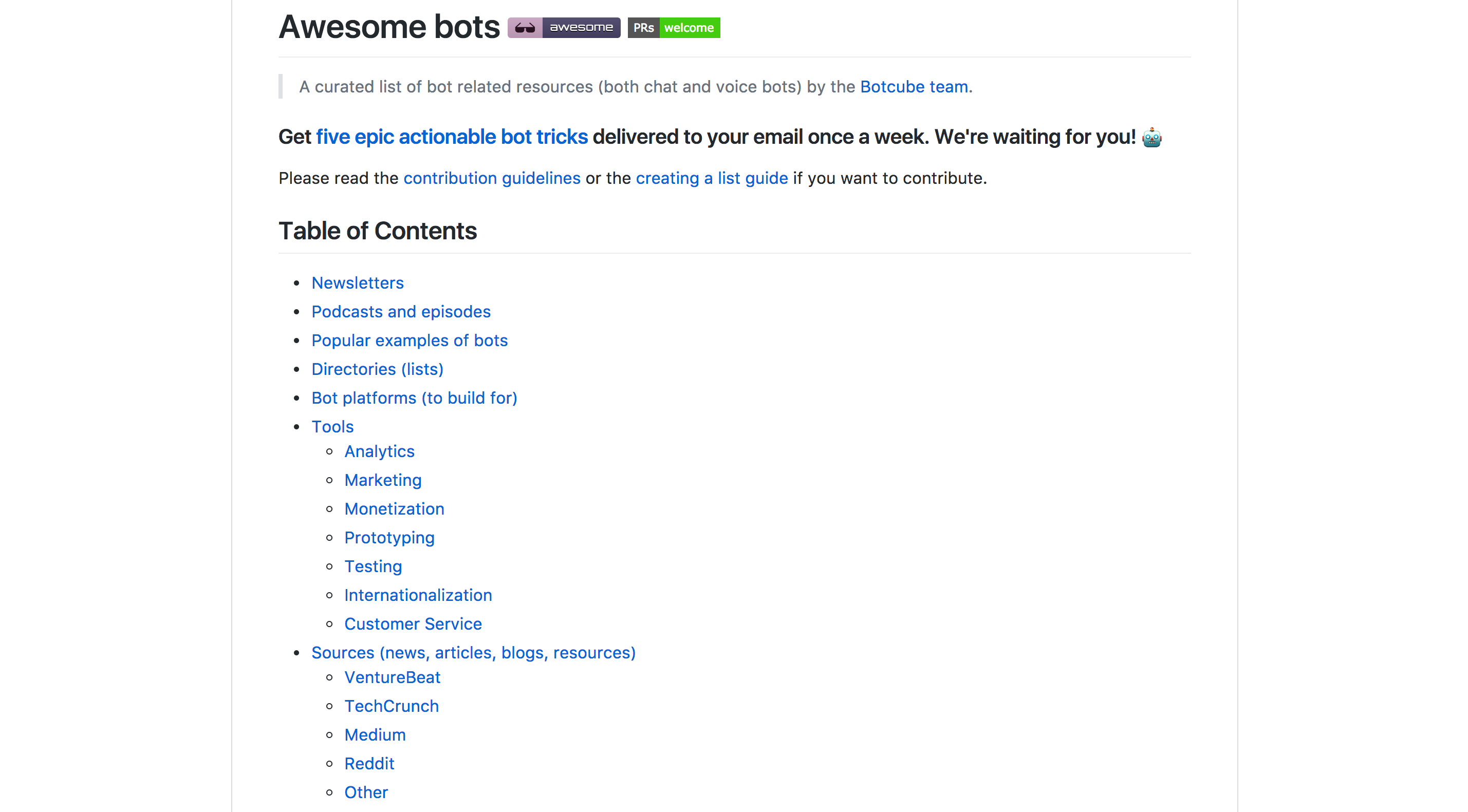 There you can find everything related to bots world from tools for development, marketing, analytics for bots to the events, books, influencers and newsletters. I hope i… See more