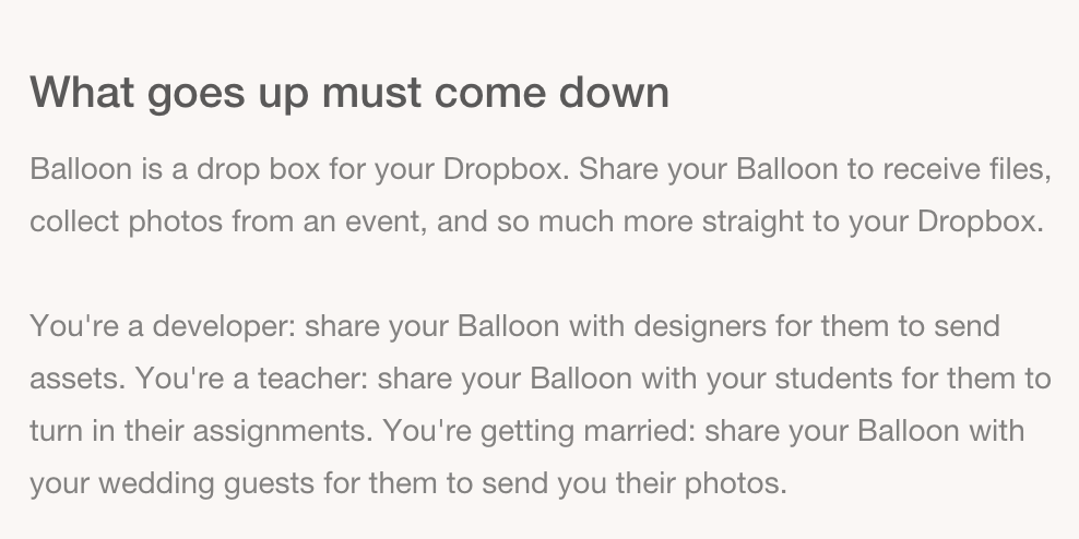 Balloon is a drop box for your Dropbox. Share your Balloon to receive files, collect photos from an event, and so much more. Files go straight to your Dropbox and accessible on any device. No more signups and no more manual downloads. Jordan and I wanted something like this badly for ourselves to… See more