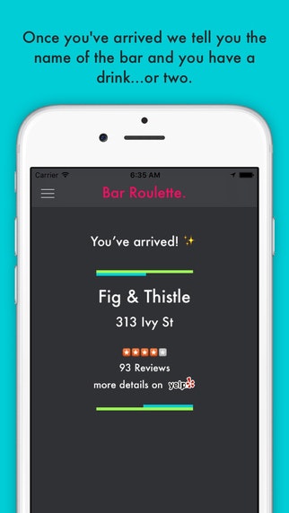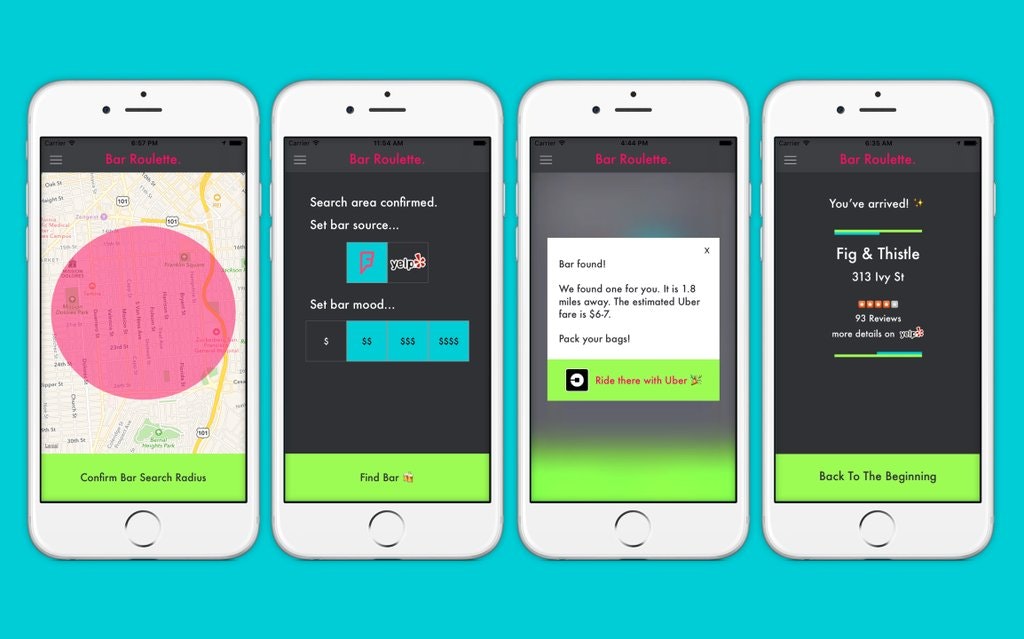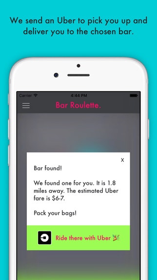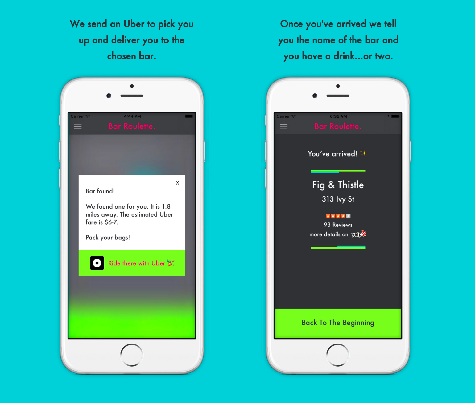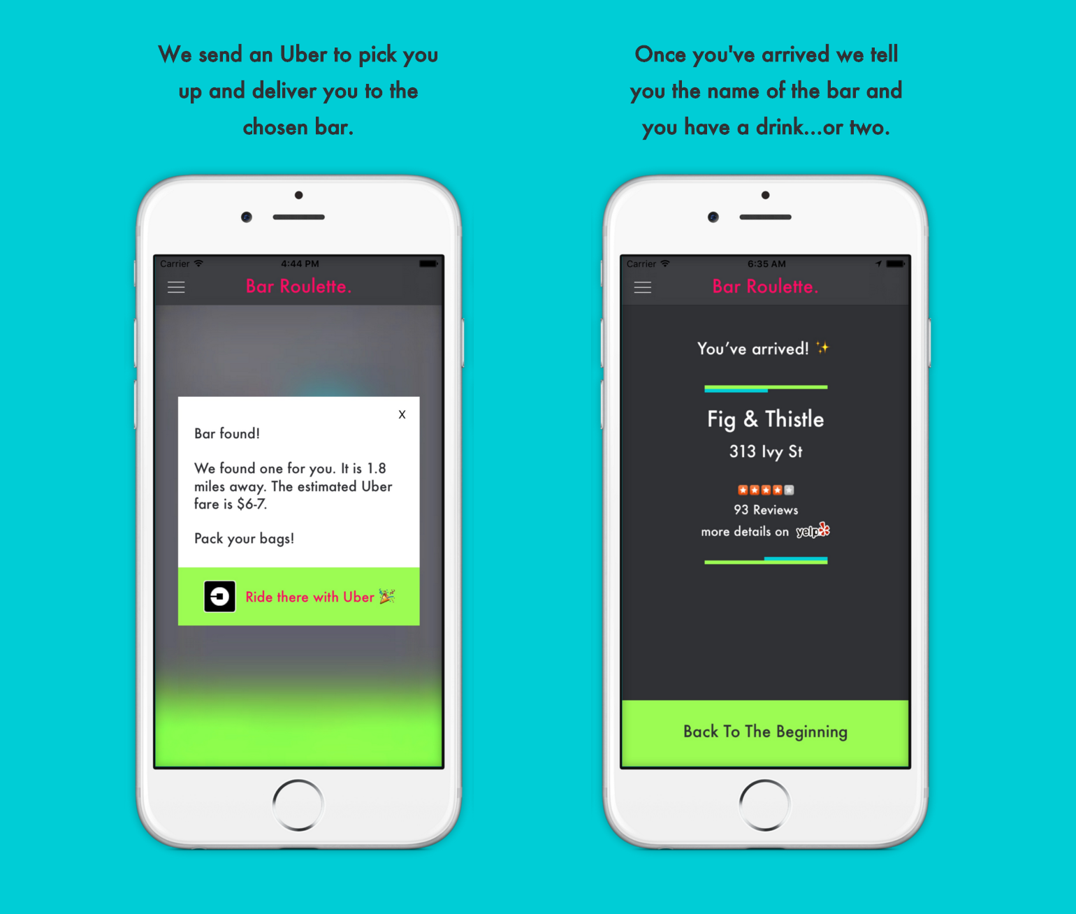 Great little app for going out and discovering your city and its bars — using Uber as your designated driver! Nice work @tylerswartz!