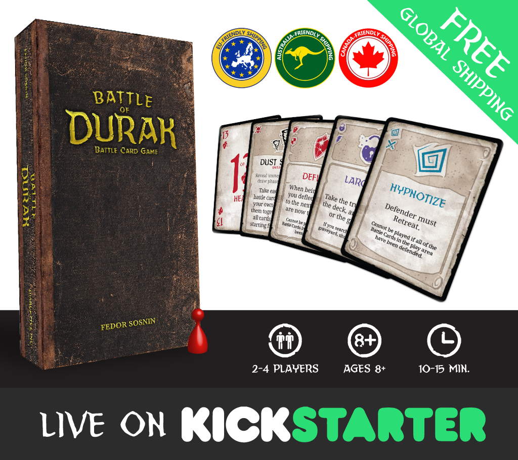 Hey all! Battle of Durak is a light, trick-taking card game in which players take on the roles of skillful warriors as they battle it out and attempt to be the first player to run out of cards.
