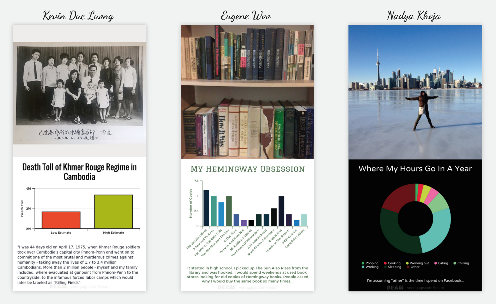 We have a collection of charts and personal stories here: https://venngage.com/chart-your-... Please check it out.