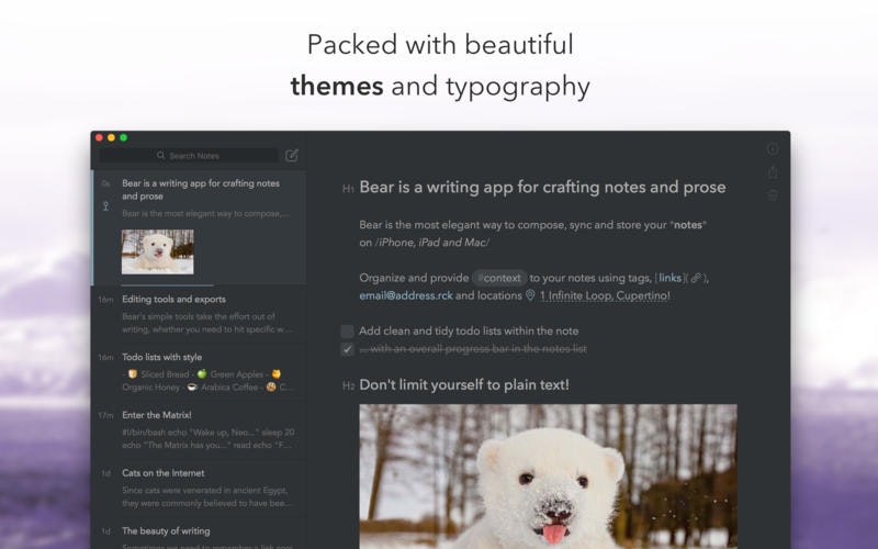 Hi everyone! We're Shiny Frog from Italy and we love to make beautiful, useful apps. We created Bear because we wanted a beautiful way to write, easily organize our notes, and publish or share in various ways. This has been a labor of love for nearly two years, and we're releasing the beta today because we'd love to hear what you think!