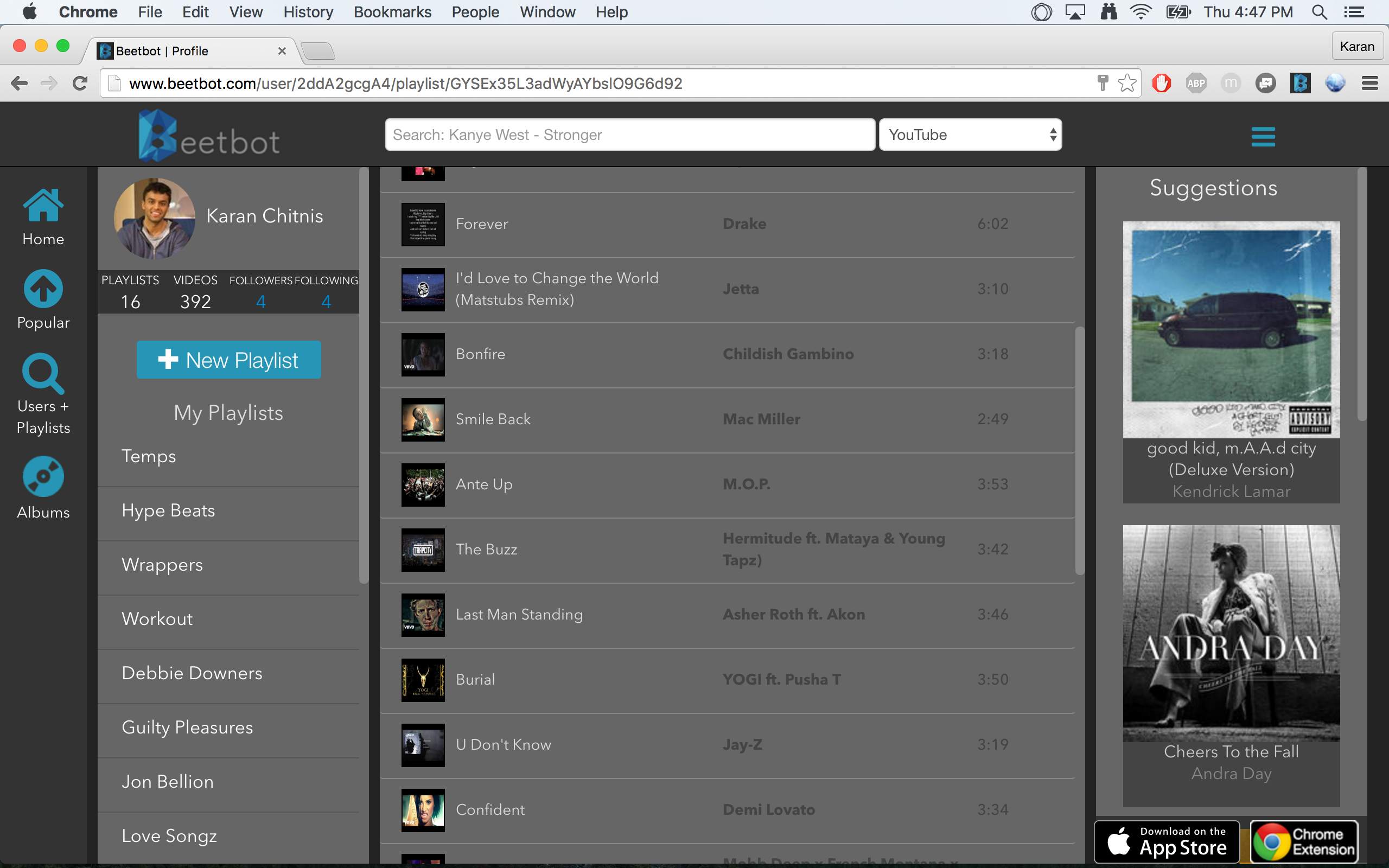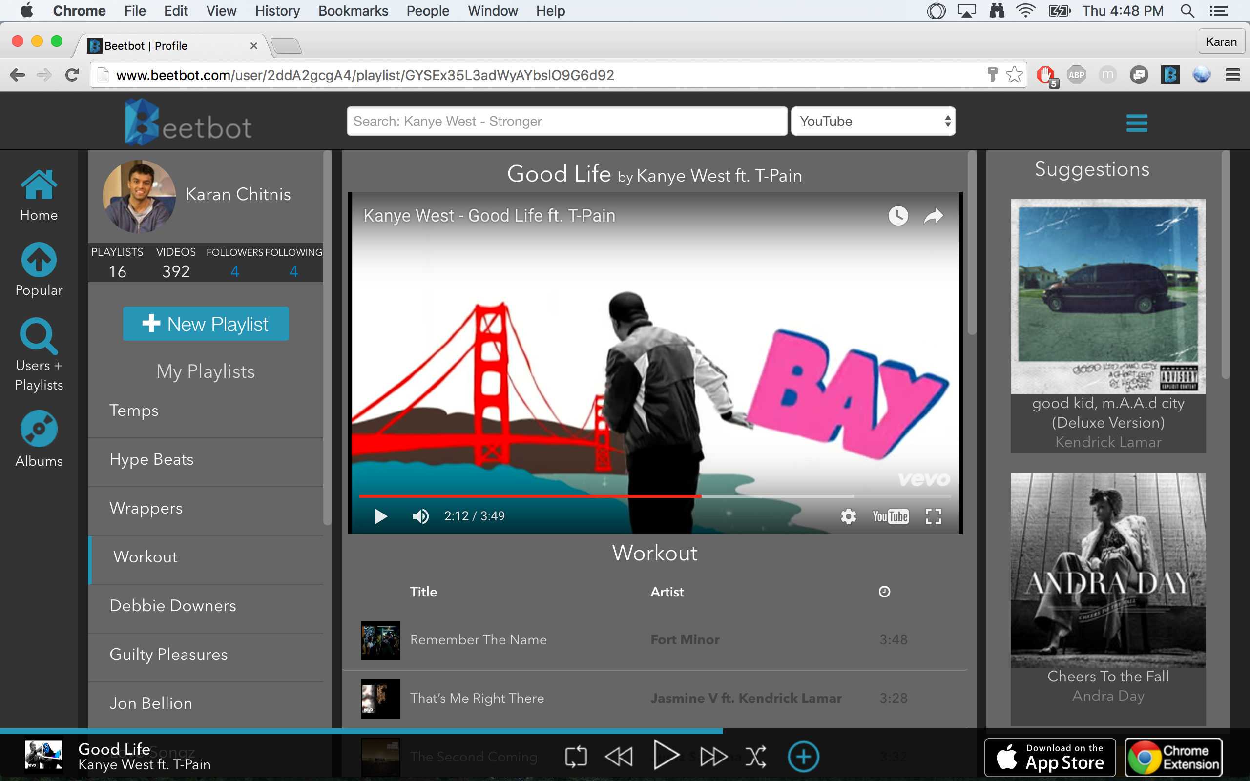 Beetbot allows you to collect and listen to songs from your favorite websites such as YouTube and Soundcloud for free. You simply have to create a playlist, add songs to it, and stream your music to your mobile device or browser. Hope you enjoy it!