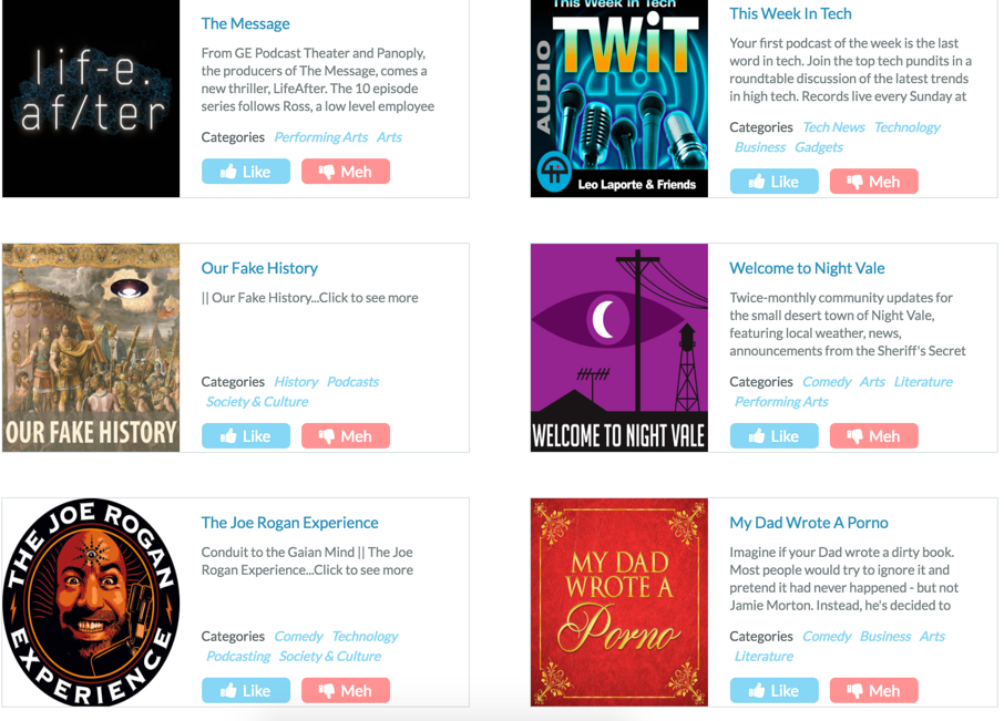 Just tell it some of your favorite podcasts (at least 3) and it'll recommend podcasts based previous users most similar to you. Right now the product is pretty bare-bone. we plan to keep… See more
