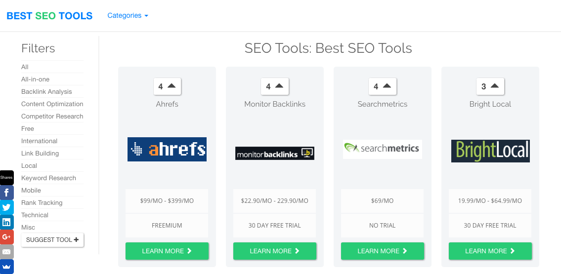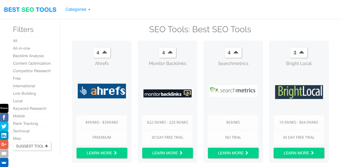 200+ Of the best SEO tools sorted by the SEO community in one place with easy filtering for most common SEO tasks (link building, keyword research, rank tracking etc). It's by far the most complete curation resource found anywhere on the web right now.