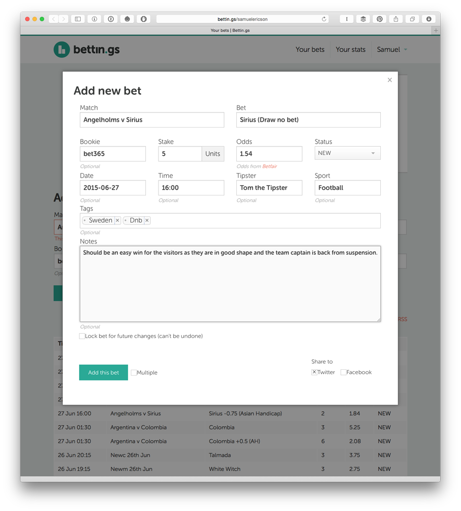 Hi, I'm Samuel. I built this website to help people keep track of their bets and become better punters. Let me know what you think, and if you have any suggestions or requests just give me a shout. Cheers!