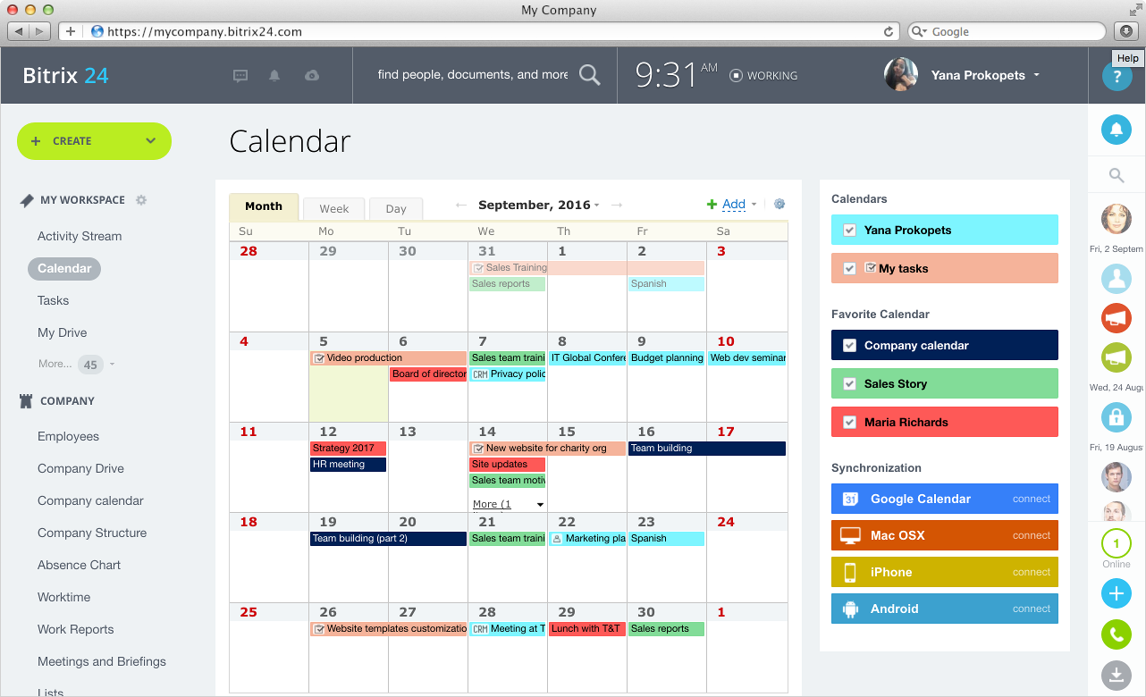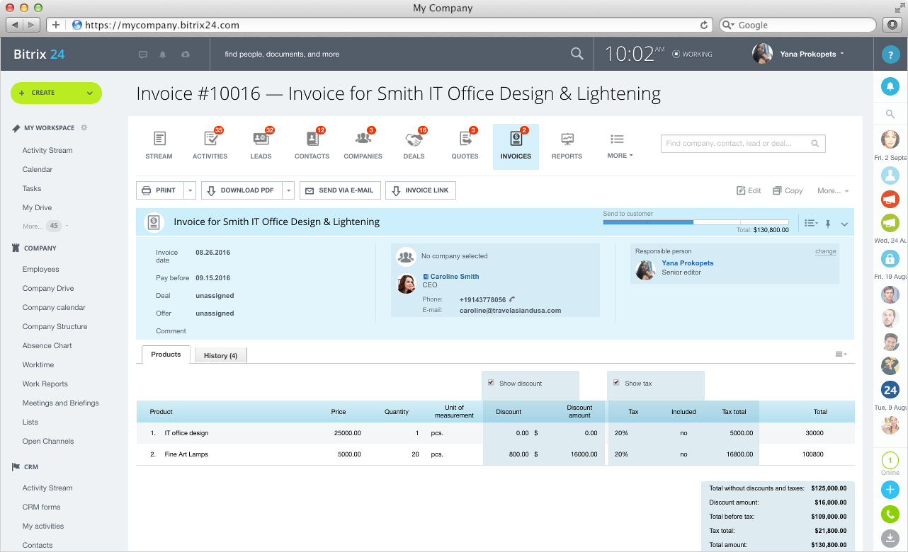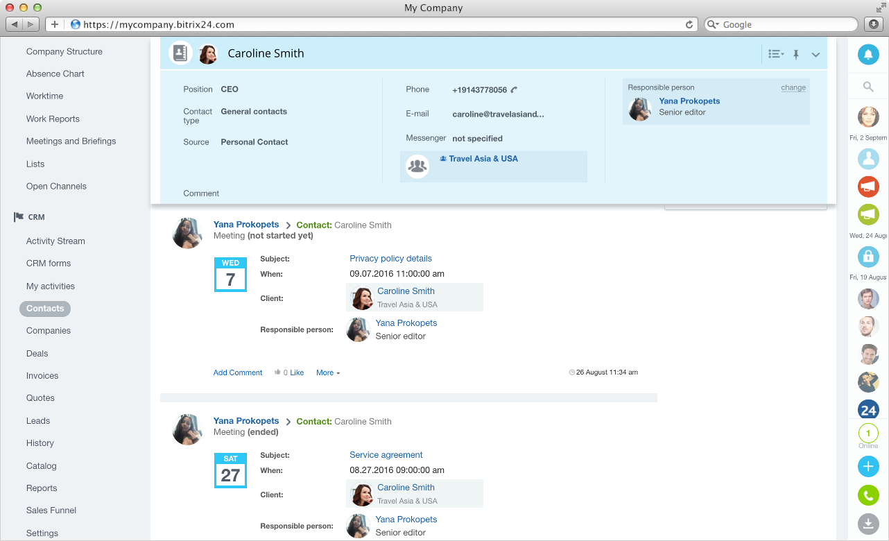 Bitrix24's CRM forms a contact base where the interaction and the history of contacts are managed and stored. All new events (phone calls, messages, meetings) connected with a contact or company are easily logged and further interaction can be planned, including by using integrated tasks.