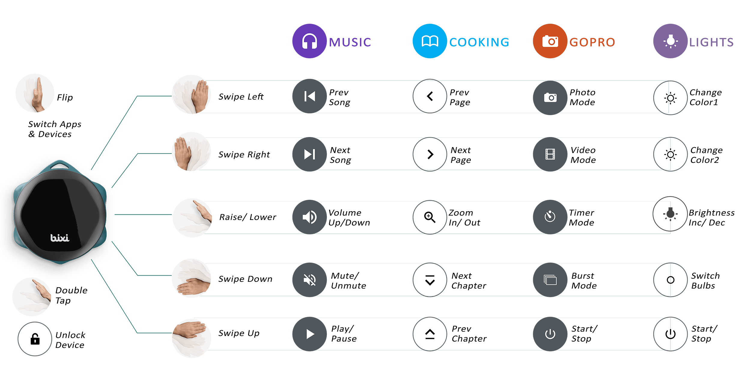 "Bixi is the first ultra-portable companion that senses your in-air hand gestures and commands the device you wish to control. Just wave your hand and let the Magic happen!"