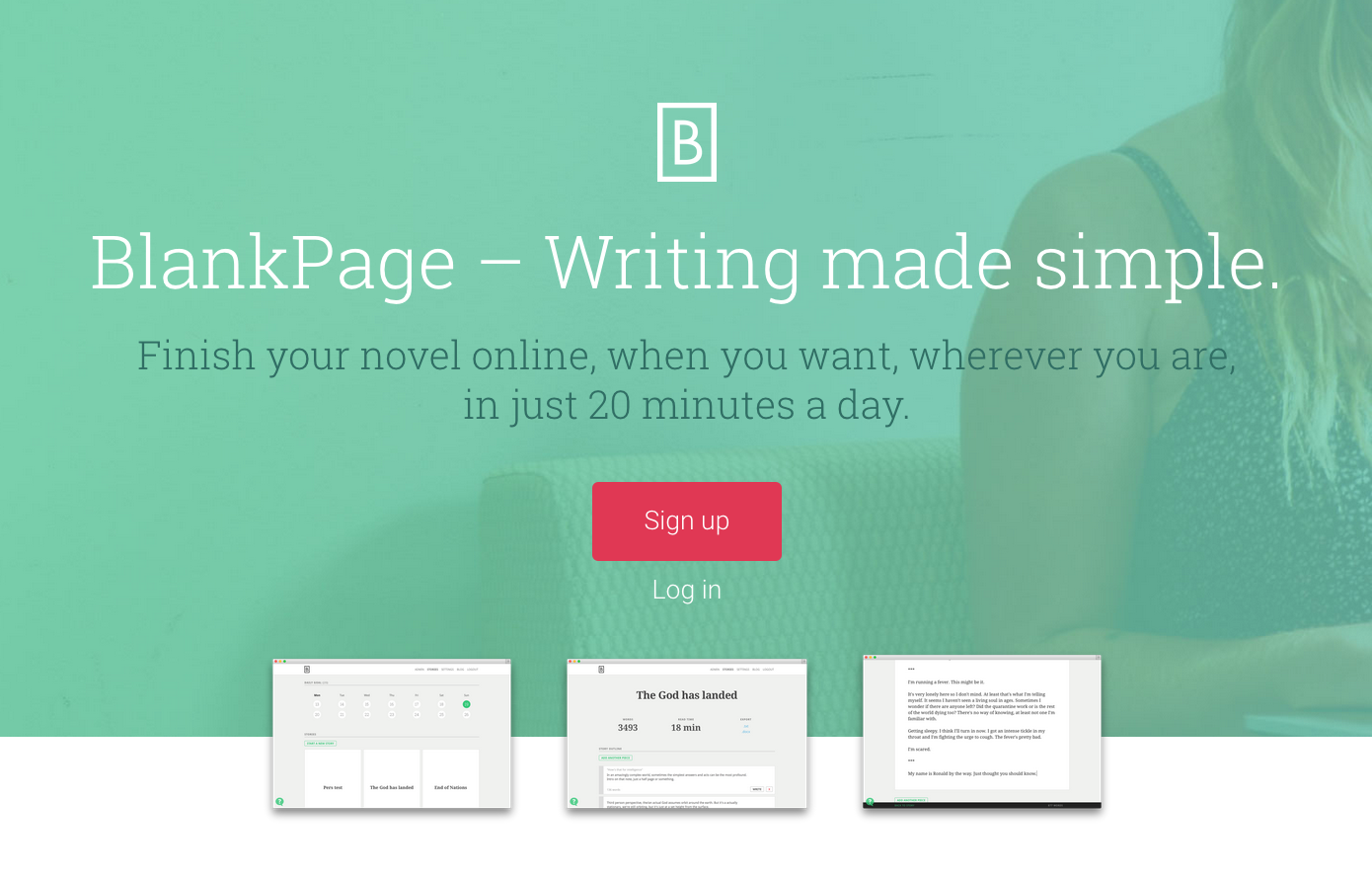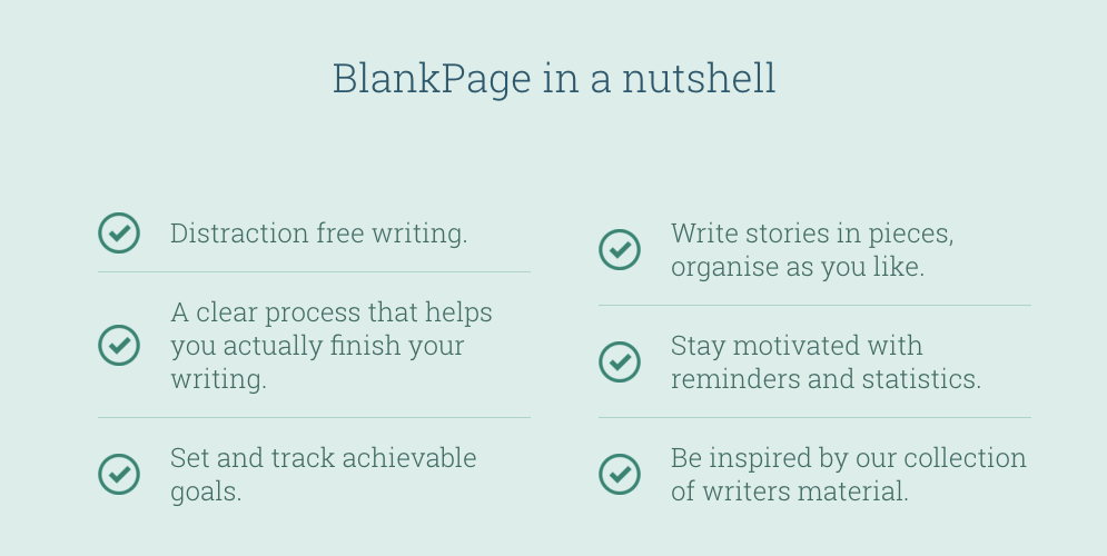 BlankPage is a motivational writing service that helps you build a habit of writing. By giving fiction writers a clear process, and helping them set achievable goals, we try to help more people than ever before finish their first drafts.