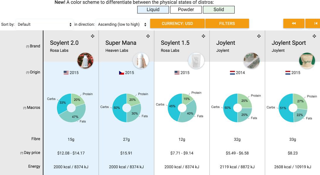 This is cool, but some information seems to be off. Rosa labs Soylent 2.0 is a base calorie value of 400kcal per bottle, not 450. Cheers!