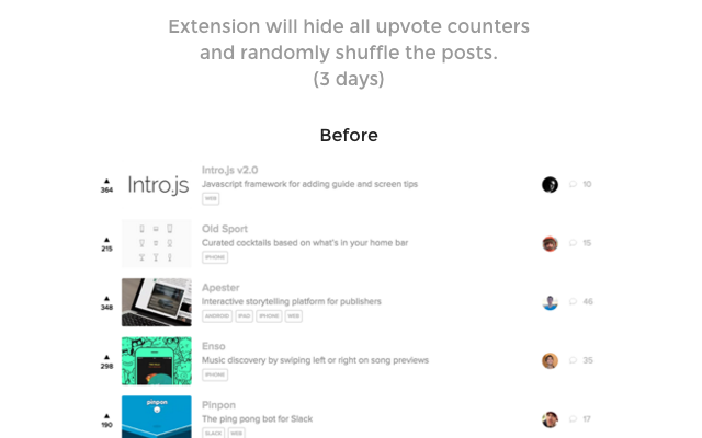 Thanks @bentossell! That's definitely the idea behind Blind Hunt. Several studies have been conducted on herd mentality and by 'hiding' the upvote counters and shuffling the posts, you spend more time on … See more