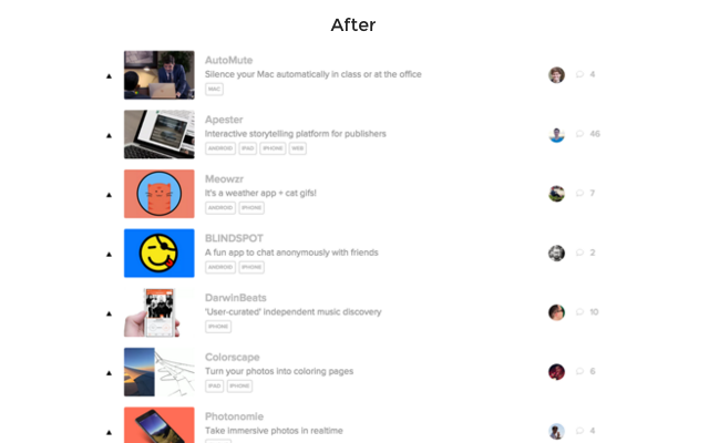 @mattpickle_ great idea and a way to help the user form their own opinion. This can really help PH. The new PH app makes it harder to view more products and have a birds eye view. It puts the emphasis on popular products. This is an innovators and early adopters community where originality (both as a maker and as a user) should be rewarded. The current desig… See more